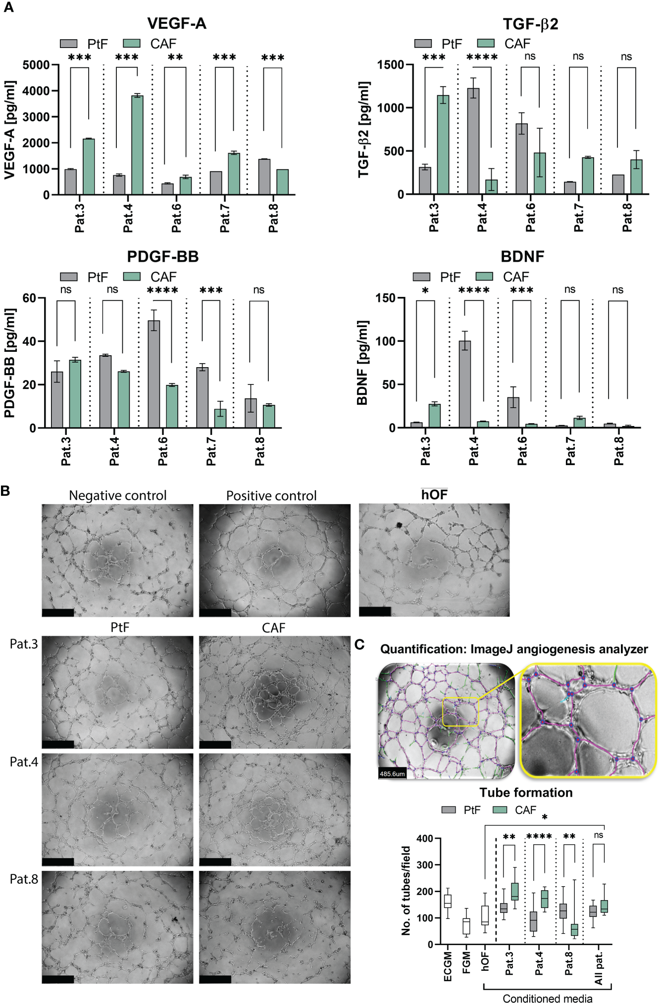 Figure 5 Growth factor secretion and effect of PtFs and CAFs on the angiogenic potential of HUVECs. (A) Secretion of VEGF-A, TGF-β2, PDGF-BB and BDNF of PtFs and CAFs was measured by ELISA in all patients (Pat.3, Pat.4, Pat.6, Pat.7 and Pat.8). Shown are mean ± SD values of each analyte from n=3 individual experiments. (B) Representative images showing angiogenic potential of HUVECs in ECGM (positive control, top right), and in FGM (negative control, top left). The lower panel shows representative images of tube formation in HUVECs when cultured in PtF/CAF-conditioned medium of Pat3, Pat.4 and Pat.8. Uper right picture shows HUVECs cultured in the presence of hOF supernatant. Images were captured after 8 hour treatment. (C) Analysis of tube formation ability in HUVECs (top panel) with purple lines depicting tubes between two connected junctions (blue dots) and green lines depicting unconnected segments. Number of connected tubes of HUVEC cultured in negative and positive controls, and with hOF/PtF/CAF-conditioned supernatants of individual patients are determined (bottom panel). Shown are mean ± SD values. P-values: ns > 0.05; * ≤0.05; ** ≤0.01; *** ≤0.001; **** ≤0.0001.