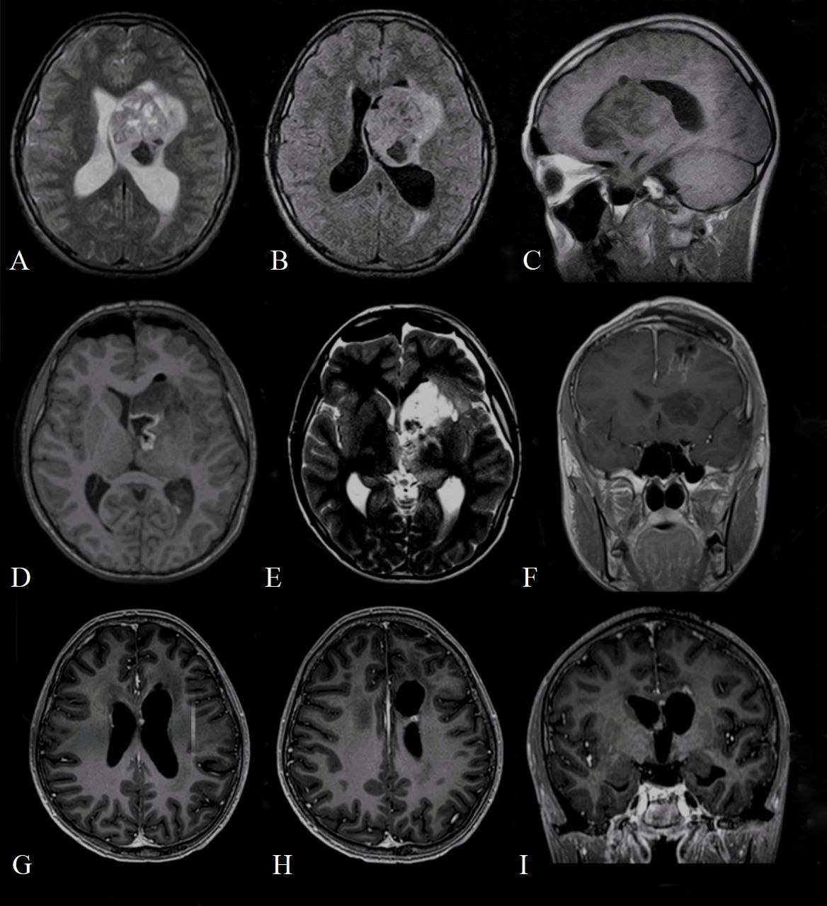 Preoperative (A) T2 axial magnetic resonance imaging (MRI); (B) T2 FLAIR axial MRI; (C) T2 sagittal MRI demonstrating mass in the left lateral ventricle with heterogeneous enhancement measuring 7.2 cm x 4.7 x 5 cm, composed of both cystic and solid areas, and extending to the frontal lobe of the brain; Postoperative (D) T1 axial magnetic resonance imaging (MRI); (E) T2 weighted image axial MRI; (F) T1 contrasted coronal MRI demonstrates the area of postoperative cystic change and residual tumor measuring 1.3 cm x 1.1 x 1 cm, actively accumulating contrast agent; contrasted T1 axial (G, H) and coronal (I) MRI at 17-month follow-up, which shows residual tumor measuring 4.5 x 3.2 mm (H) and 4.3 x 2.6 mm (G).