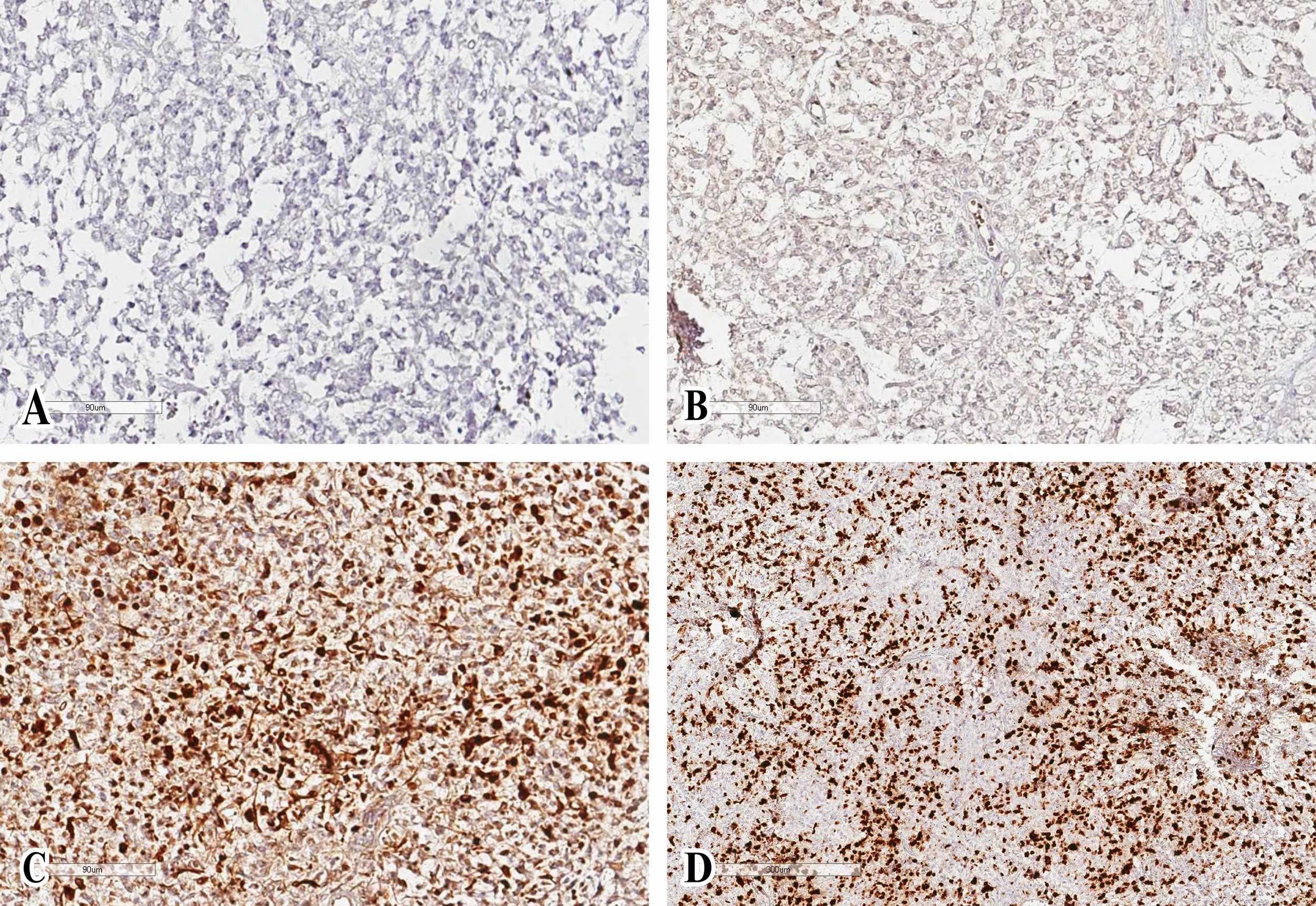 Histologic specimen with features consistent with atypical teratoid/rhabdoid tumor. Glial fibrillary acidic protein (A) and epithelial membrane antigen (B) immunochemistry demonstrates diffuse positivity. Cytokeratin AE1/AE3 (C) was not positive in tumor cells. The proliferative activity of tumor cells is high, the Ki-67 index is 40-50% (D).