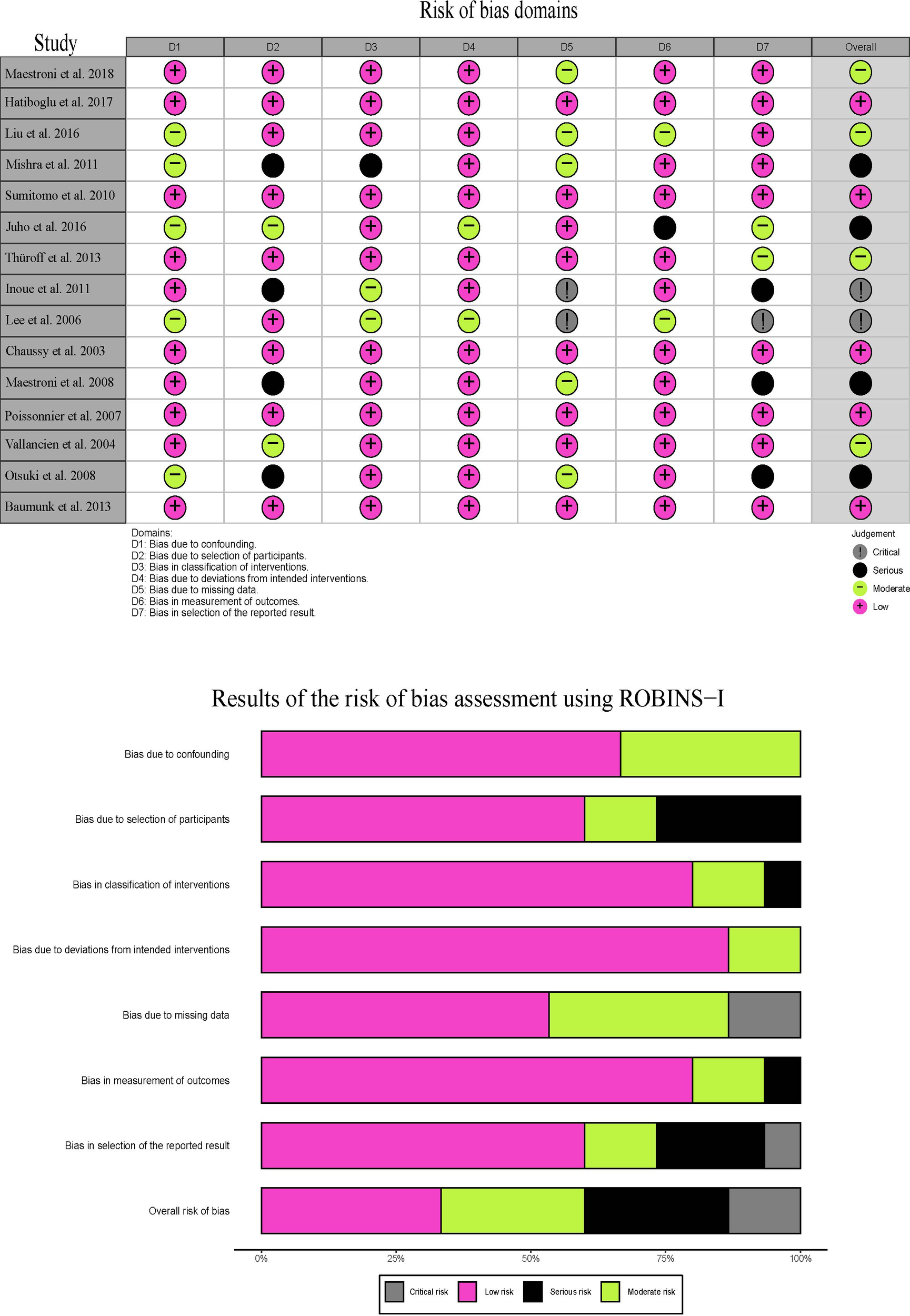 There were 5 prospective studies and 10 retrospective studies in this systematic review. Among these studies, only one was multicentric study and the remaining 14 studies were all single-institutional. Twelve of included studies utilized an Ablatherm© device, and three studies utilized a Sonablate-500© device. The characteristics of eligible studies are reported in Table 1. Quality of included studies was assessed using the ROBINS-I scales tool and the assessment results were shown in Figure 2.