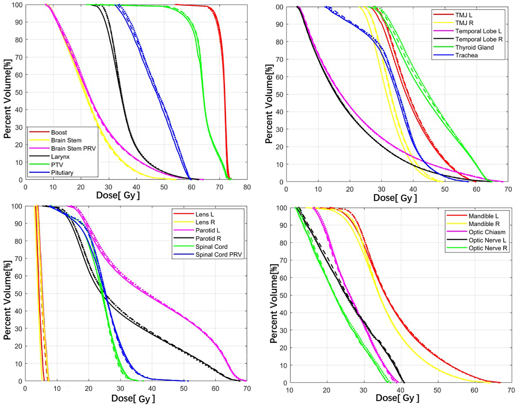 Comparison of the mean DVHs between the COM model (dash lines), ANAT model (dot lines), and GT (solid lines).