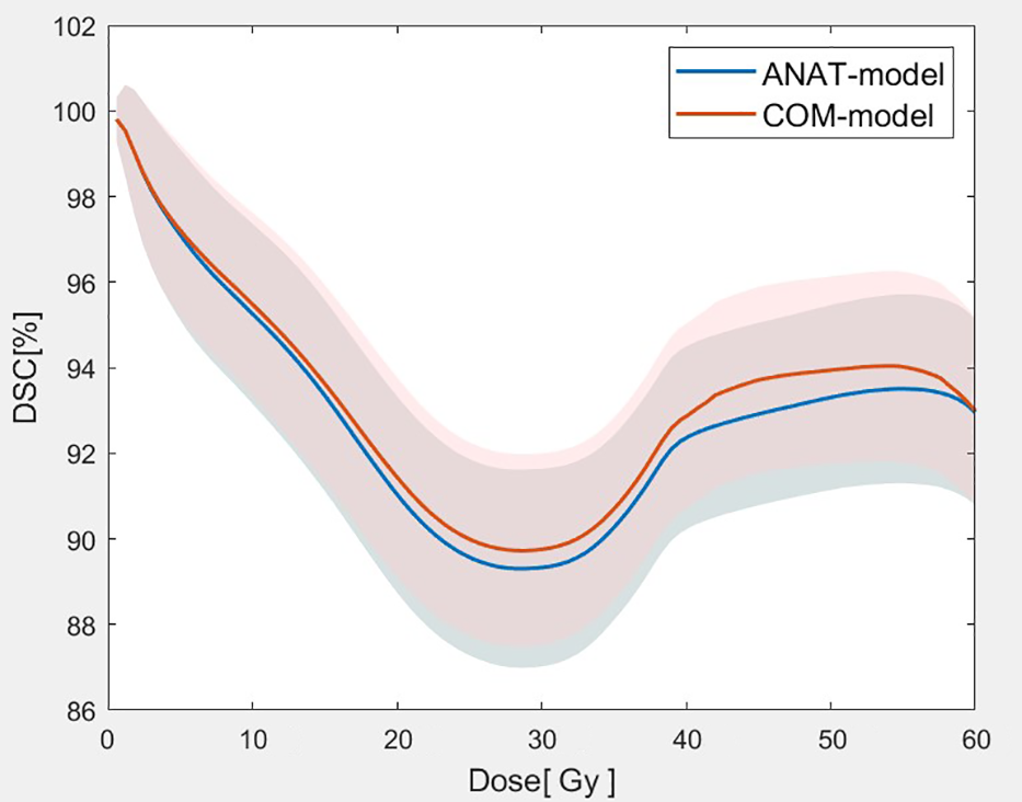 As Figure 4 shows, the mean DSC values of the isodose volumes within the range of prescription (1 Gy - 60 Gy) dose were all better for the COM model than for the ANAT model. Table 3 shows that, the mean DSC deviations of isodose between the two models from 10 Gy to 55 Gy ranged from 0.22% to 0.80% were with highly statistical significance (p<0.001). For the DSC at 5 Gy isodose, the deviations were also statistically significant (p = 0.01). The lowest DSC values for the ANAT model and COM model were 89.30% and 89.72% respectively, when the isodose was approximately equal to 30 Gy.