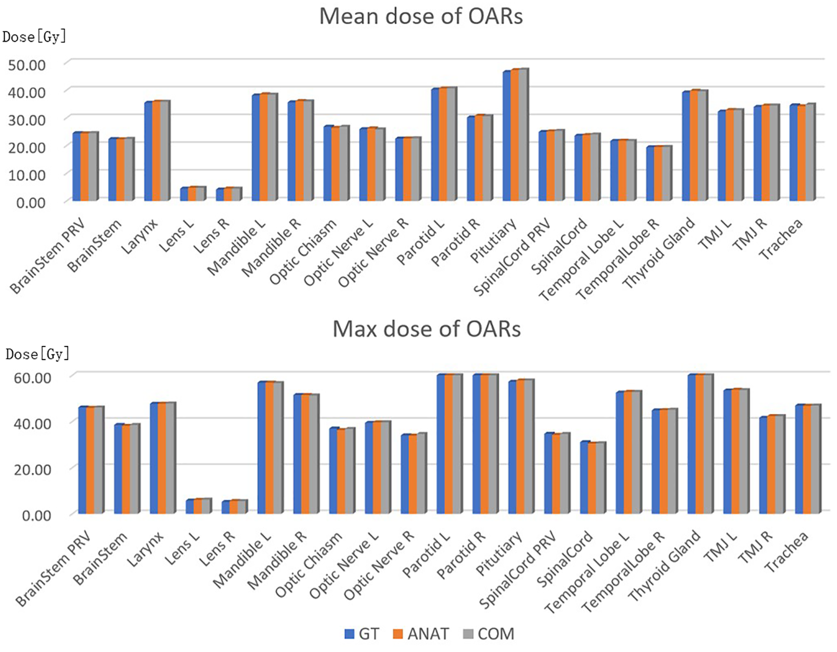 The mean MAE of the body volume of the COM model were 4.89 ± 1.35%, highly significantly lower than those for the ANAT model of 5.07 ± 1.37% (p<0.001). The ME values of the body for the 2-type models were similar (p >0.05). The mean DSC values of the isodose volumes in the range of 60 Gy were all better in the COM model (p<0.05), and there were highly significant differences between 10 Gy and 55 Gy (p<0.001). For most organs at risk, the ME, MAE, and dosimetric parameters predicted by both models were concurrent with the ground truth values except the MAE values of the pituitary and optic chiasm in the ANAT model and the average mean dose of the right parotid in the ANAT model.