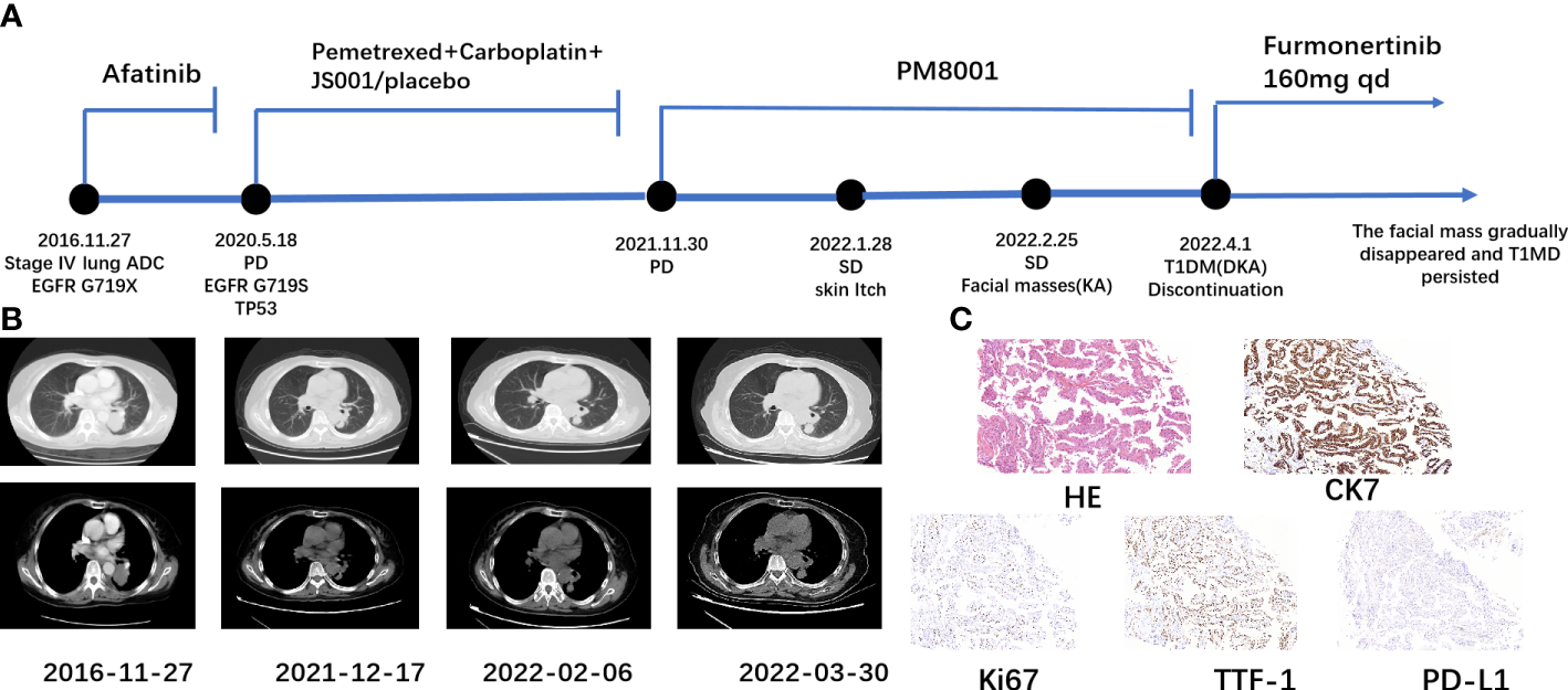 Here, we report a case of a 67-year-old woman who developed eruptive keratoacanthoma of the skin and T1DM-induced ketoacidosis after treatment with PM8001, a bispecific antibody targeting both PD-L1 and TGF-β (Figure 1A). Computed tomography (CT) on 27 November 2016 showed a left lower lung occupancy (Figure 1B). Bronchoscopic biopsy and immunohistochemical (IHC) analysis revealed adenocarcinoma with positive expression of TTF-1, CK7, PD-L1, and Ki67 (Figure 1C). Due to the rapid growth of the lesions, surgical treatment was not appropriate, and epidermal growth factor receptor (EGFR) genetic testing revealed EGFR (G719X). The patient received afatinib-targeted therapy for 3 years with regular routine blood and chest CT examinations. On 18 May 2020, chest CT re-examination indicated considerable tumor progression, and tissue needle biopsy suggested EGFR (G719S) and TP53-positive, T790M-negative. After further evaluation, the patient received a continuous regimen of “pemetrexed 762 mg + carboplatin 435 mg + JS001 (toripalimab)/placebo 240 mg D1” from 23 June 2020 to 19 November 2020. Tumor progression was detected on review (30 November 2021), but no obvious JS001/placebo-related adverse events occurred during the treatment. She was then enrolled in a phase I clinical trial to evaluate the tolerability, safety, and pharmacokinetic profile, as well as the preliminary efficacy, of PM8001 injection for patients with advanced tumors, and a phase IIa clinical trial to examine the preliminary efficacy in patients with advanced tumors (protocol number CPM8001-A001), which was conducted by Pumis Biotechnology (Zhuhai) Co., Ltd. The patient received continuous treatment with PM8001, administered intravenously at 1,066 mg (20 mg/kg) every 14 days per course, from 1 January 2022 to 25 March 2022.