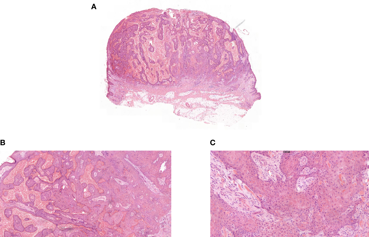 (A) Pathologic biopsy of facial mass ultralow power view. (B) Pathologic biopsy of facial mass magnification 50×. (C) Pathologic biopsy of facial mass magnification 200×.