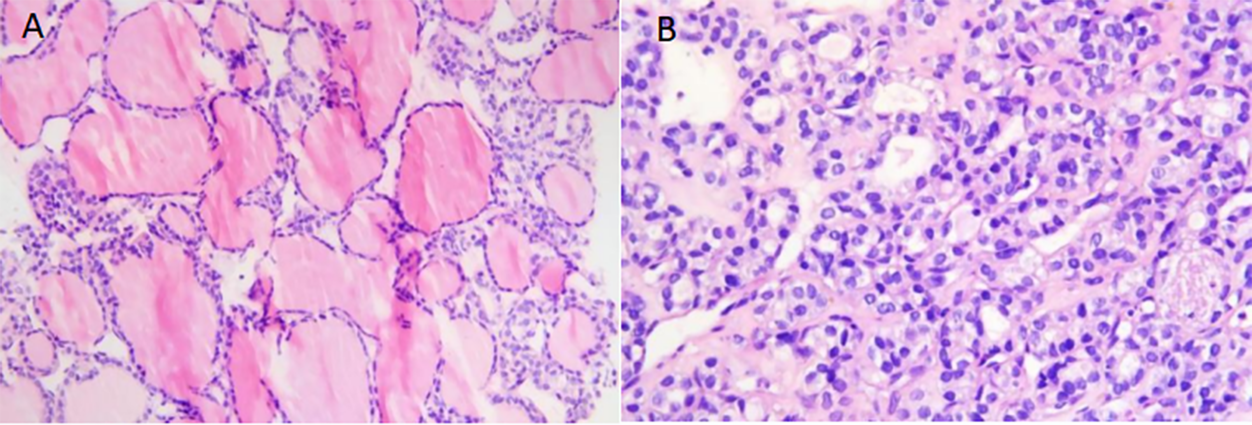 (A) Microscopically, thyroid follicles of different sizes were observed, and the cells were well differentiated. No ground-hyaline nuclei, nuclear furrows, sand bodies, or papilla were observed. The appearance of follicular tumor was consistent with bone metastasis of thyroid follicular carcinoma. (original magnification, × 400; hematoxylin-eosin [H-E] stain). (B) The tumor cells were dense and crowded, similar to fetal thyroid tissue, with a small number of follicles, nuclear atypia, and rare pathological mitosis.(original magnification, × 600; hematoxylin-eosin [H-E] stain).