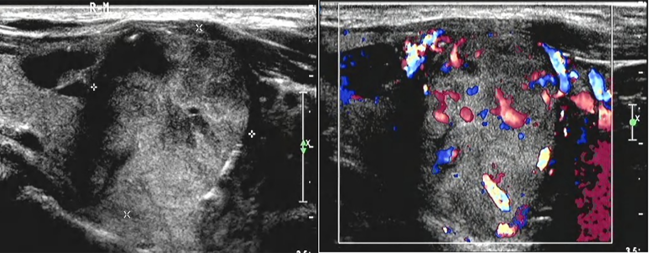 There was a solid lobe nodule on the right side of the thyroid gland, about 30mm × 28mm in size, with clear boundary, mainly solid in the thyroid gland, with irregular and non-echogenic inclusions. A short strip of strong echo could be seen around the nodule, and rich blood flow signals could be seen in and around the nodule.