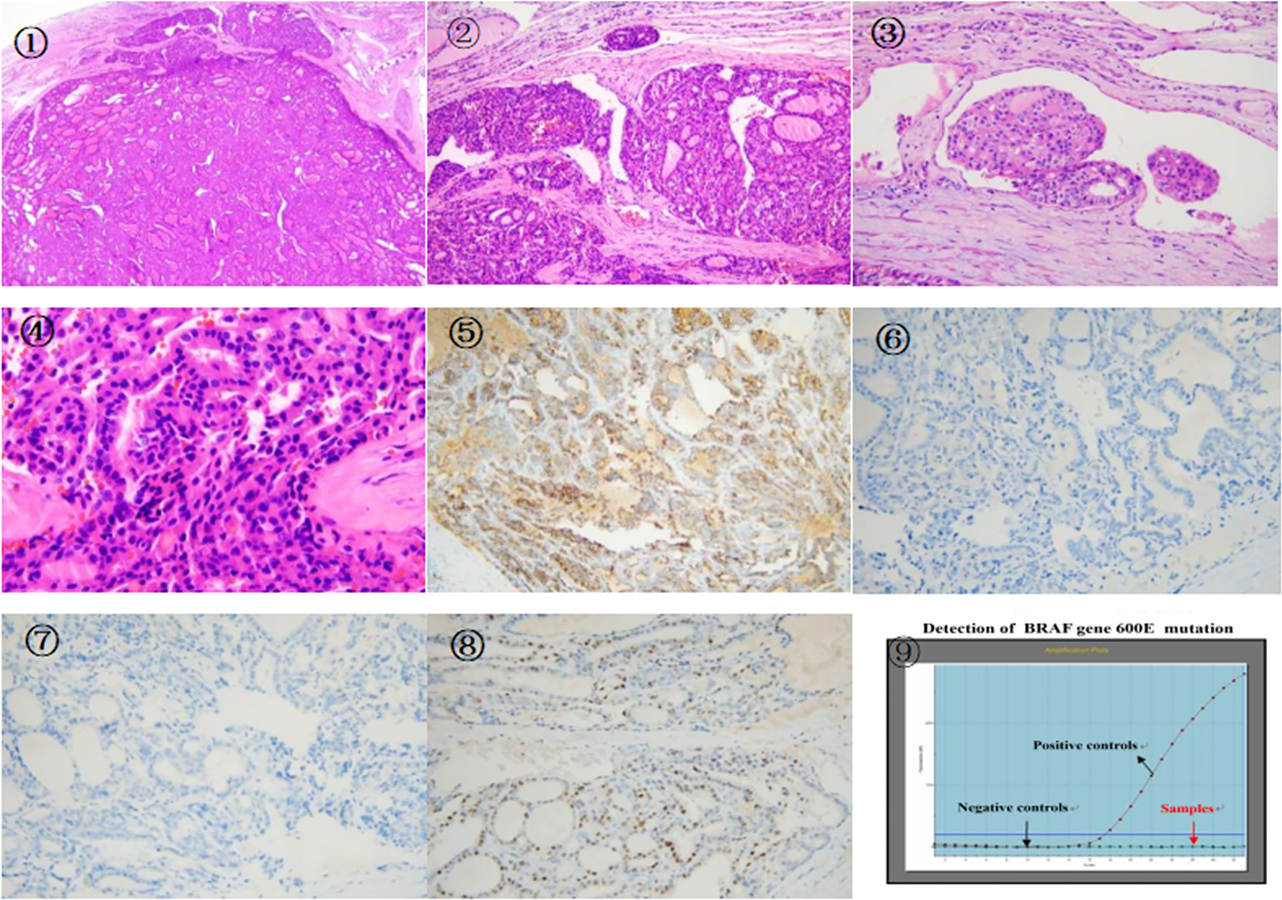 ①There is a follicular tumor, fibrous capsule was seen around the tumor,the tumor invaded the capsule and vasculature,extrapulocapsular and intravascular tumor thrombus can be seen.(original magnification, × 20; hematoxylin-eosin [H-E] stain). ② An enlargement of the previous picture,the tumor invaded the vasculature and capsule,there was a vascular tumor thrombus.tumor cells had eosinophilic cytoplasm,the cells showed mild atypia,(original magnification, × 100; hematoxylin-eosin [H-E] stain). ③ The tumor invaded the vasculars and tumor thrombus,(original magnification, × 400; hematoxylin-eosin [H-E] stain). ④ High magnification of tumor invasion capsule,the tumor cells were dense and crowded, the nuclei were hyperchromatic, there was no ground hyaline nucleus, no nuclear furrow, no nuclear overlap, and no sand body (original magnification, × 600; hematoxylin-eosin [H-E] stain). ⑤ Some cells of MC were positive by immunohistochemistry EliVision method magnification at medium power. ⑥ Immunohistochemistry: Tumor cells were negative for CK19 EliVision method magnification at medium power. ⑦ Immunohistochemistry showed that the tumor cells were negative for Galectin-3 EliVision method magnification at medium power. ⑧ Immunohistochemistry showed that a small number of tumor cells were positive for CyclinD1 EliVision method magnification at medium power. ⑨ BRAF V600E gene mutation was not detected by RTPCR.