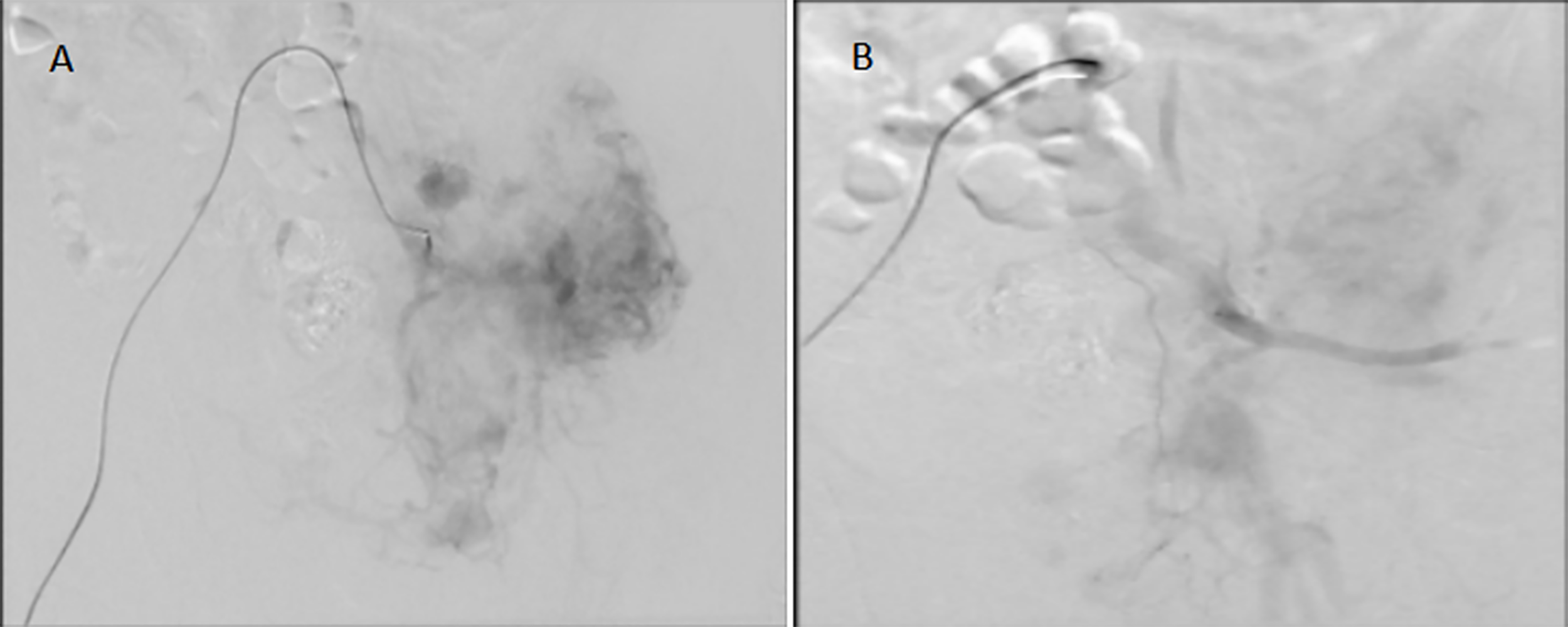 Embolization of the left pelvic tumor artery. (A): before tumor artery embolization; (B):after tumor artery embolization.