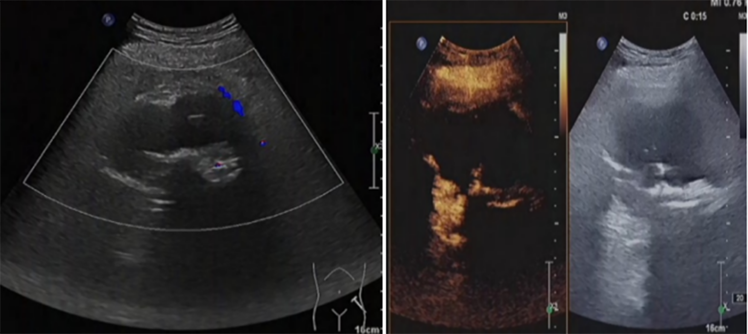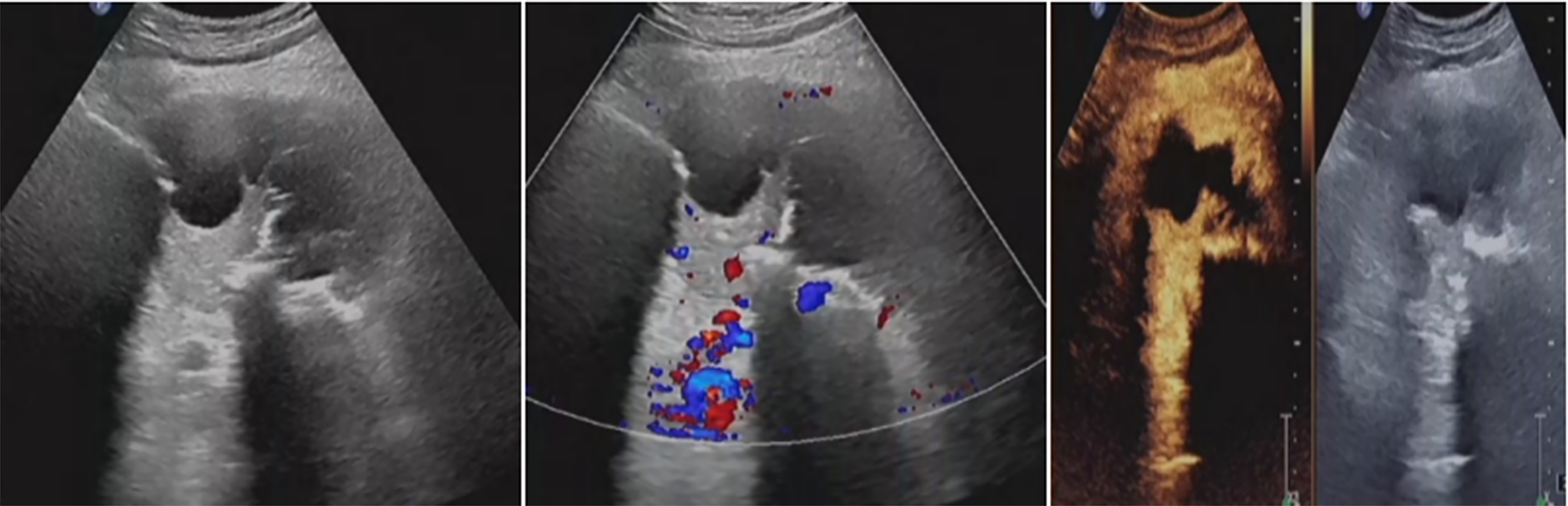 The subsequent treatment course was as follows:131I treatment which is a Radioactive Iodine Therapy(RAI), was performed in the Nuclear Medicine Department of our hospital with a dose of 200mCi. Two weeks after surgery, the patient reported relief of pain in the left pelvis. After a few months of rest at home, the patient underwent a whole-body bone SPECT/CT scan in August 2019, which revealed multiple miliary and nodular thickened shadows in both lungs and indicated the possible lung metastasis of thyroid follicular carcinoma. No obvious change was found with the bone metastasis. The second 131I treatment was then performed in the Nuclear Medicine Department of our hospital with a dose of 200mCi. The patient complained of pain in the left pelvis and difficulty in walking. After MDT discussion, multi modal sequential combined therapy was proposed: embolization of the blood supply artery to the left pelvic metastasis would be performed in the hope of blocking the blood supply to the main body, followed by fractional percutaneous ablation to inactivate the residual tumor. In July 2020, left pelvic tumor artery embolization was perfomed on the patient in the interventional radiology department of our hospital (Figure 5), with left and right internal iliac arteries embolized by gelatin sponge microstrips via catheterization, costing about 120ml of iodoxanol. Angiography findings showed that corresponding to the left iliac bone and adjacent area, angiography of the left internal iliac artery showed tumor vessels; tumor staining was seen in the parenchymal stage; the boundary part was clear; the right internal iliac artery was also involved in tumor blood supply; after gelatin-sponge microstrip embolization, the blood flow of the left and right internal iliac arteries slowed down significantly. Three days after embolization, the patient had no obvious discomfort. Ultrasound-guided fractional radiofrequency ablation (Figure 6) was then performed under intravenous basic anesthesia. Intraoperative contrast-enhanced ultrasound showed that the left pelvic metastasis was about 70% inactivated by embolization, with residual active areas seen in the surrounding area. Multi-point and multi-needle radiofrequency ablation was then performed with a power of 120W, which took 30 minutes. Postoperative contrast-enhanced ultrasound showed that the tumor was basically inactivated. However, for fear of serious complications, the medial area close to the left iliac vessel and important nerve passage was left untreated. The operation was successful, and the patient had no obvious discomfort. The second supplementary ablation was performed half a month later. Considering the large local tumor load and multiple lung lesions, radiotherapy and targeted therapy were added. From July 2021, he received 25 rounds of hip radiotherapy successively. At the same time, the patient was treated with 5 courses of targeted drug anlotinib at 12mg qd, each course lasting for two consecutive weeks followed by a 1-weak recovery period. The patient reported abated pain. In December 2021, contrast-enhanced ultrasound (Figure 7) was re-examined: The tumor lesion on the left pelvis was smaller than before surgery, with a range of 83mm×54mm, and no blood flow signal was observed in most areas, indicating no significant activity of the lesion. At present, the patient still has occasional pain in the left pelvis, and he takes tramadol, morphine and oxycontin daily for analgesic treatment. Subsequent targeted therapy with anlotinib was performed. The follow-up showed stable condition, with no tumor progression found (Figure 8).