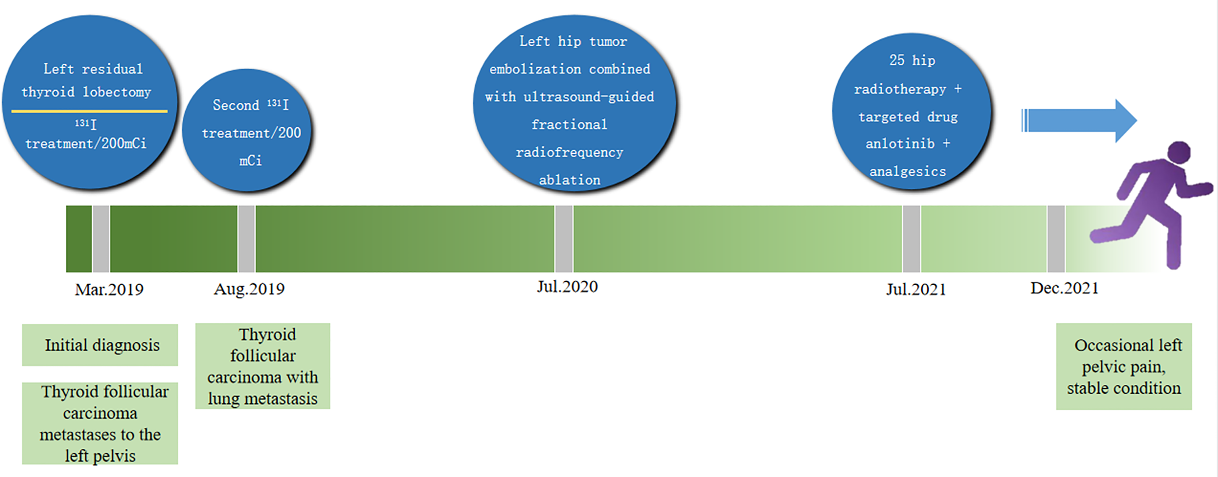 Thyroid follicular carcinoma with bone metastasis required multimodal and comprehensive treatment, including radioactive iodine therapy, palliative treatment, surgical treatment and targeted drug therapy. Among them, radioactive iodine therapy, as the first-line treatment, has good efficacy. FTC is the most sensitive to 131I, and most of the metastatic lesions retain the iodine uptake function. Therefore, 131I therapy is an effective means to treat residual primary lesions and metastatic lesions of FTC. Woodrum et al. believed that 131I treatment was one of the comprehensive treatment methods of FTC, which can treat recurrent or metastatic cancer (9). In the case of single distant metastasis, surgical resection of the metastasis and postoperative 131I treatment can achieve good therapeutic effect (10–12). In the case of multiple metastases, 131I treatment should be the first choice, which can effectively reduce serum Tg level, relieve pain and improve patients’ quality of life. Lee et al (13) believed that the survival rate of patients with bone metastasis was significantly lower than that of patients with lung metastasis and lymph node metastasis, mainly due to poor uptake of 131I in bone metastasis. The general principle of 131I treatment was to perform total or subtotal thyroidectomy to enhance iodine concentration in metastatic carcinoma before 131I therapy was performed. But if the size of the metastasis was too large, the efficacy of 131I therapy was limited, and other treatments should be combined. Palliative care mainly included vascular embolization, radiofrequency ablation and external irradiation, which can significantly relieve pain and nerve compression symptoms and improve patients’ quality of life. Surgical treatment was mainly suitable for persistent pain at bone metastasis or poor medical treatment effect. Anlotinib was a novel small-molecule multi-target tyrosine kinase inhibitor, which can strongly inhibit vascular endothelial growth factor receptor, platelet-derived growth factor receptor, fibroblasts growth factor receptor, stem cell factor receptor and other targets, and had anti-tumor angiogenesis and tumor growth inhibition effects (14, 15). Sun (16) et al. conducted a phase II study of anlotinib in the treatment of patients with locally advanced or metastatic thyroid cancer, in which patients with unresectable locally advanced or metastatic thyroid cancer were given oral anlotinib treatment until disease progression, death or unacceptable toxic reactions happened. the primary endpoint being progression-free survival. Results: a total of 58 patients enrolled did not meet the primary endpoint of progression-free survival at the time of analysis, 56.9% had a partial response, and progression-free survival at 48 weeks was 85.5%.The safety profile of anlotinib was available in a phase IIB study involving 62 patients with locally advanced or metastatic thyroid cancer (17). These results suggested that anlotinib shows persistent antitumor activity with controllable adverse reactions in locally advanced or metastatic thyroid cancer, which may promise a new effective treatment for patients with advanced or metastatic thyroid cancer. In this case, after bone metastasis of thyroid follicular carcinoma was pathologically confirmed by biopsy of the left pelvis, residual thyroid lobule resection was performed and 131I was combined to further remove the lesion. One noteworthy feature of the case was that the volume of metastatic lesions was huge at the first diagnosis of the patient, which was difficult to be cured by iodine therapy. Therefore, multimodal combined treatment was required. Arterial embolization therapy + ultrason-guided radiofrequency ablation were conducted for the damaged lesions in the left pelvic metastatic foci, followed by targeted therapy + pelvic radiotherapy, finally inactivating all the huge metastatic foci, thus successfully controlling the huge pelvic tumor. This case provided a reference method for the treatment of difficult large metastases. For large metastases, the combination of multiple methods can safely and effectively inactivate the tumor body. Cooperating with them, radiotherapy and targeted drugs could be used to control the progression of residual tumors. Such treatment was a relatively practical and effective method in that it not only achieve reliable effect, but can also reduce the side effects caused by high dose of targeted drugs and correspondingly help prolong the survival and improve the quality of life of patients.