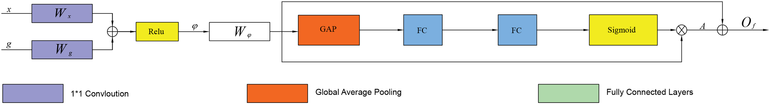 First, the feature maps x∈RCx×W×H and g∈RCg×W/2×H/2 are converted from different scale layers into a unified size and mapped to the feature spaces of a, b, respectively. Then, a 1 x 1 convolution is performed, and a bit-by-bit summation is carried out. Finally, the fused feature map is obtained by activating the Relu function. The feature map can be defined as φ: