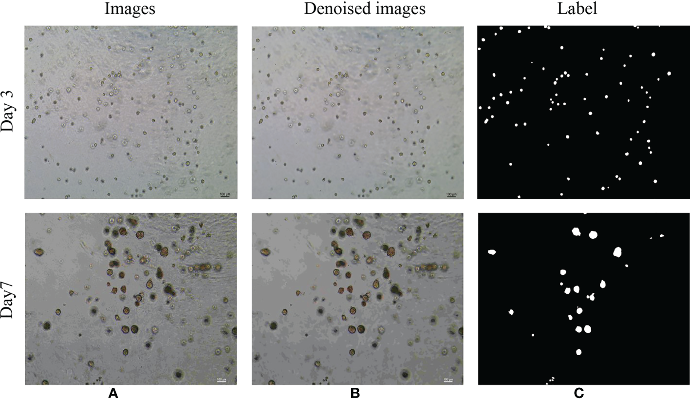 Examples of the original microscope image and corresponding denoised images of bladder cancer organoids. (A) Microscope images of bladder cancer organoids on culture day 3 and day 7 (B) Denoised images based on the microscope images of bladder cancer organoids. (C) The labels generated from denoised images of bladder cancer organoids.