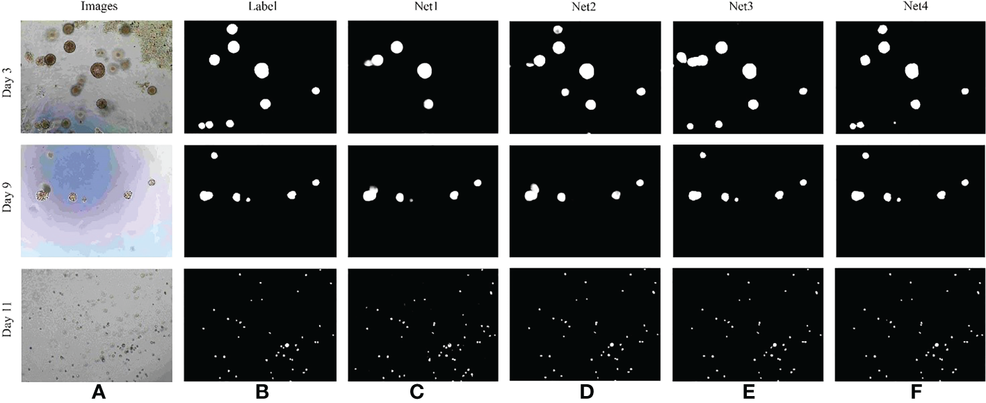 The purpose of bladder cancer organoid segmentation is to divide the pixels in the organoid image into organoid pixels and background pixels. There are four possible segmentation results: True Positive (TP), which indicates that the pixels in the organoid images marked by experts are classified correctly as organoids; False Negative (FN), indicating that the organoid pixels in the images marked by experts are classified incorrectly as background; True Negative (TN), indicating that the background pixels in the organoid images marked by experts are classified correctly as background; False Positive (FP), indicating that the background pixels in the images marked by experts are classified incorrectly as organoids. In order to evaluate the segmentation results, four evaluation indicators of accuracy (Acc, accuracy), sensitivity (Se, sensitivity), specificity (Sp, specificity), and F1–Score are used to evaluate the segmentation effect objectively. The definitions of evaluation indicators are shown in Table 3.