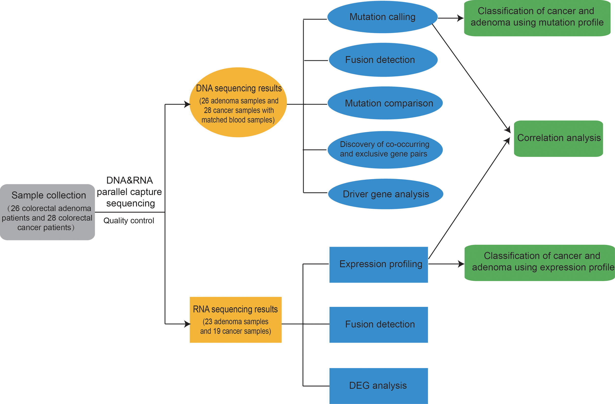 In this work, DNA and RNA parallel capture sequencing data covering 519 genes from colorectal adenoma and colorectal cancer samples were collected. The somatic mutation profiles were obtained from DNA sequencing data, and the expression profiles were obtained from RNA sequencing data.