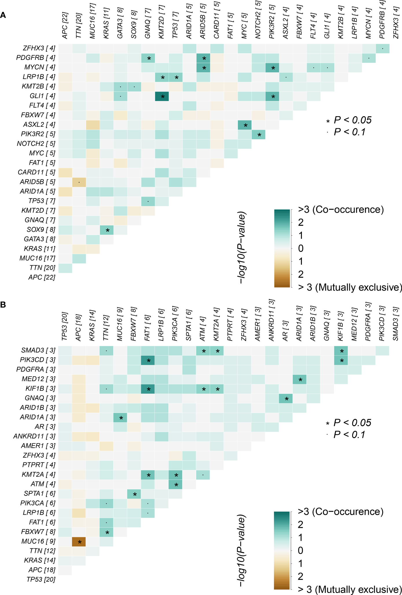 Mutually exclusive and co-occurring gene pairs in (A) colorectal adenoma samples and (B) colorectal cancer samples.