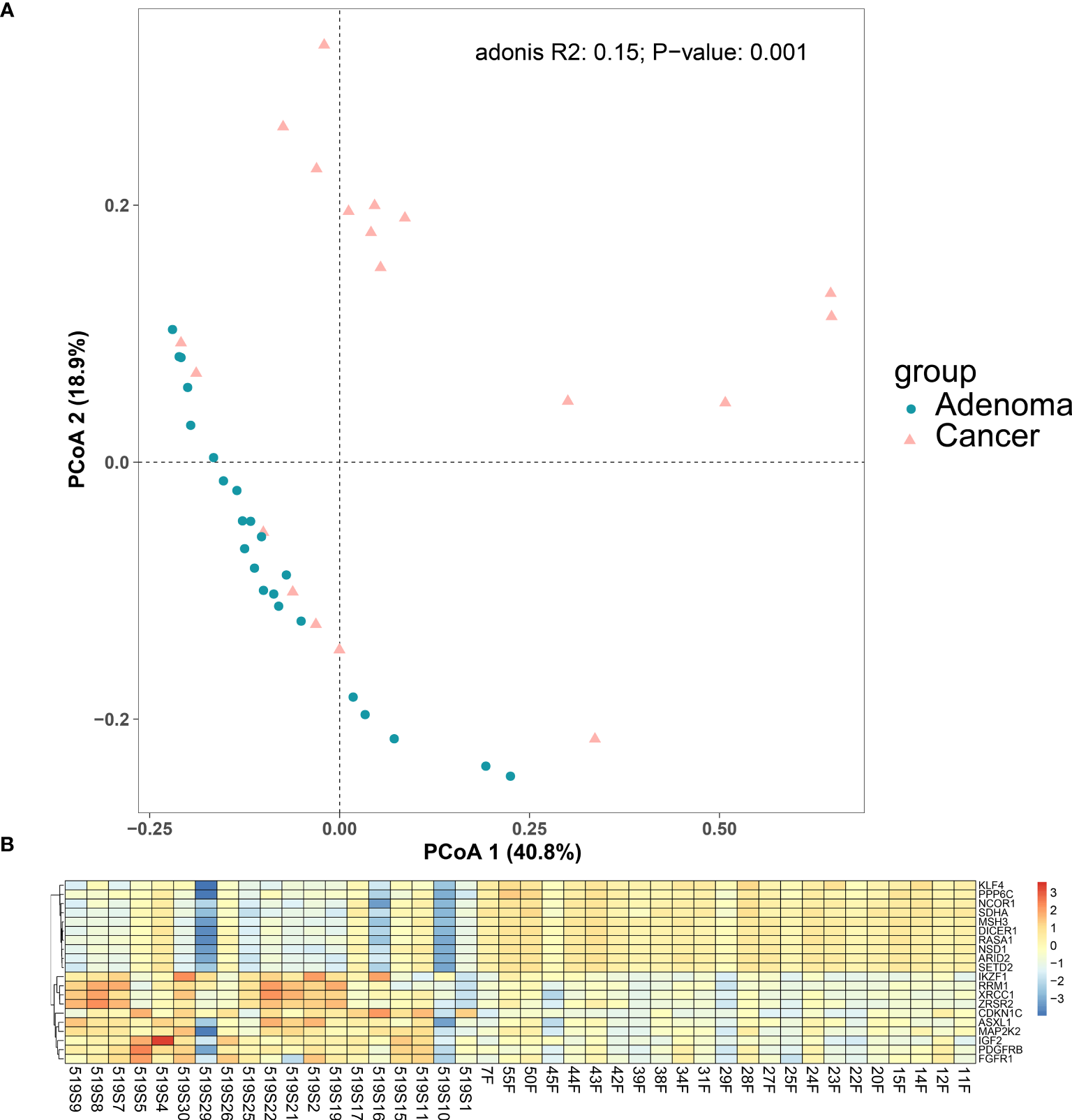 Differences between colorectal cancer group and adenoma group. (A) PCoA plot for the cancer group and the adenoma group. (B) Differentially expressed gene between the colorectal cancer group and the colorectal adenoma group. Top 10 differentially expressed genes in colorectal cancer samples (1–19 on the horizontal axis) compared with adenoma samples (20–42 on the horizontal axis).