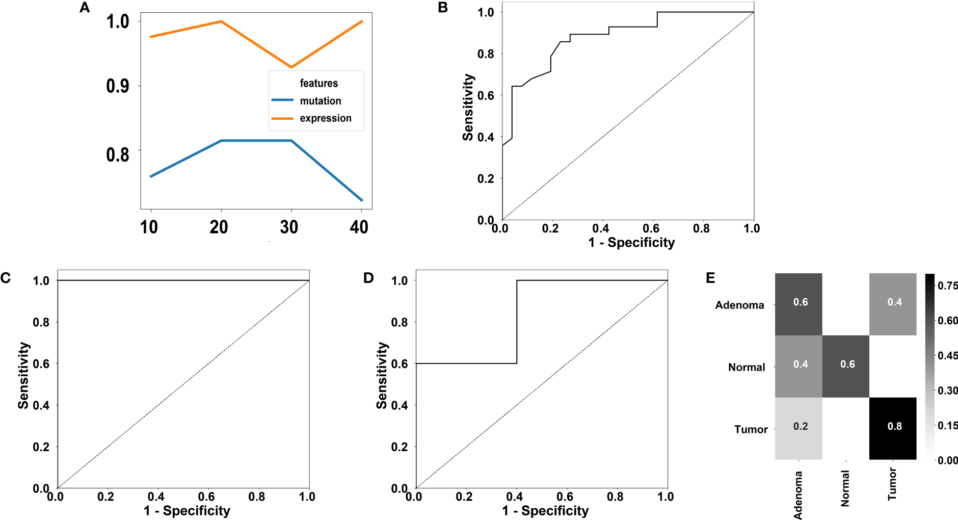 Performance of classification of colorectal adenoma and cancer using our 519-gene panel. (A) Accuracies using different gene number for mutation or expression profiles. (B) ROC using 20 genes for mutation profiles. The AUC is 0.88. (C) ROC using 20 genes for expression profiles. The AUC is 1.00. (D) ROC of the GSE16454 dataset containing 5 adenoma samples and 5 cancer samples. The AUC is 0.84. (E) Confusion matrix of a two-fold cross validation using the GSE164541 dataset utilizing the 20 informative genes discovered in our expression profiles.
