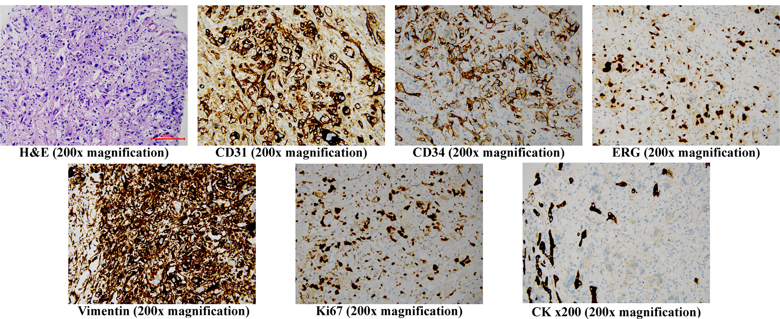 Figure 2 Histopathology staining of the core needle liver biopsy specimen H&E (200x magnification) shows cells with pleomorphic nuclei and frequent mitotic figures, solid nodules of similar atypical spindled endothelial cells and focal areas of with epithelioid morphology. Immunohistochemistry (200x magnification) shows the cells to be positive for CD31, CD34, ERG, Vimentin and Ki67, but negative for CK, H&E, hematoxylin and eosin.