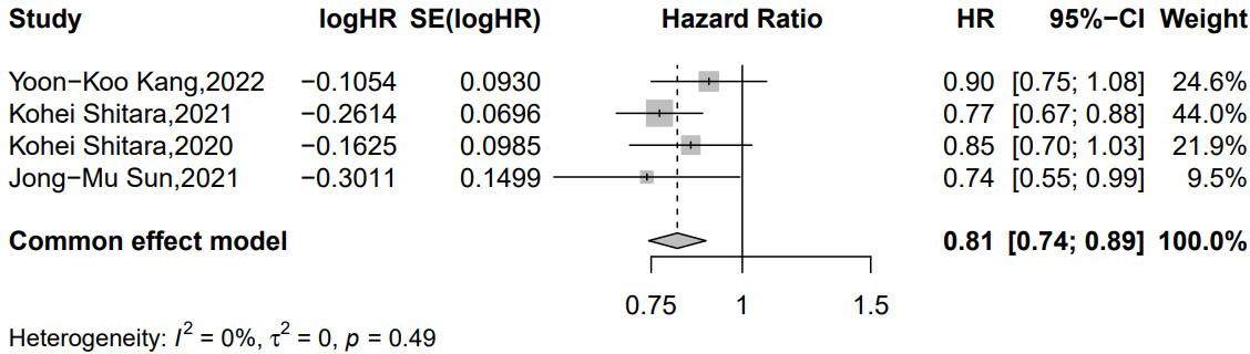 Four studies reported OS (21, 22, 25, 26); 356 patients and 1,151 patients received pembrolizumab- and nivolumab-based chemotherapy, respectively. There was no significant heterogeneity among the studies. The results show that ICIs plus chemotherapy improved the median OS compared to standard chemotherapy in the first or subsequent treatment of advanced EAC/GEA. This is similar to the significance suggested by our pooled (HR = 0.81 [95% CI: 0.74–0.89]; p < 0.001) without obvious heterogeneity (p = 0.49, I2 = 0%) (Figure 3).