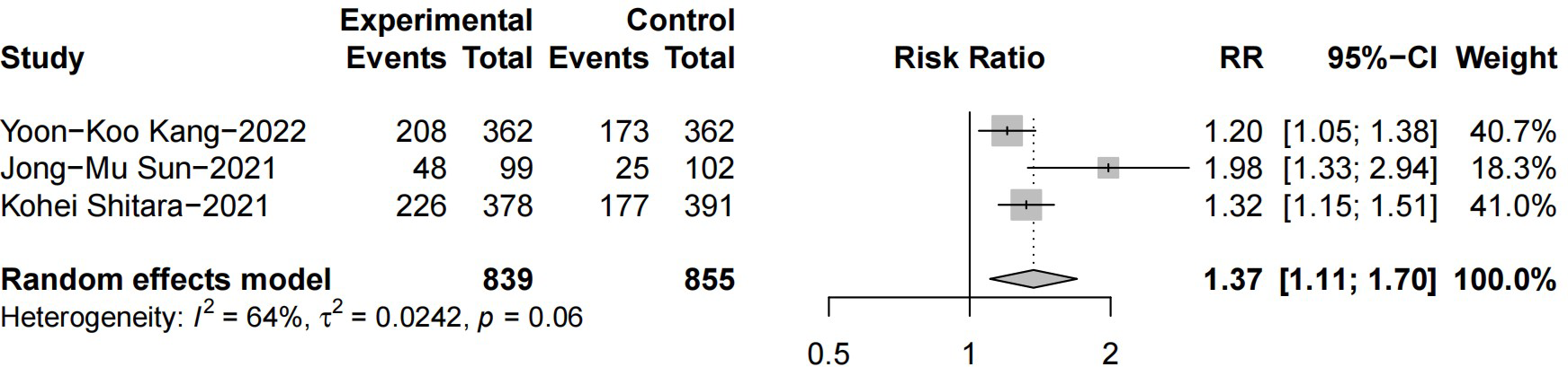Regarding the disease response rate, our results demonstrated that patients benefited from ICIs plus chemotherapy when compared to chemotherapy alone (RR = 1.37 [95% CI: 1.11–1.70]; p = 0.004; Figure 5), and there was no conspicuous heterogeneity (p = 0.06, I2 = 64%) within these studies.