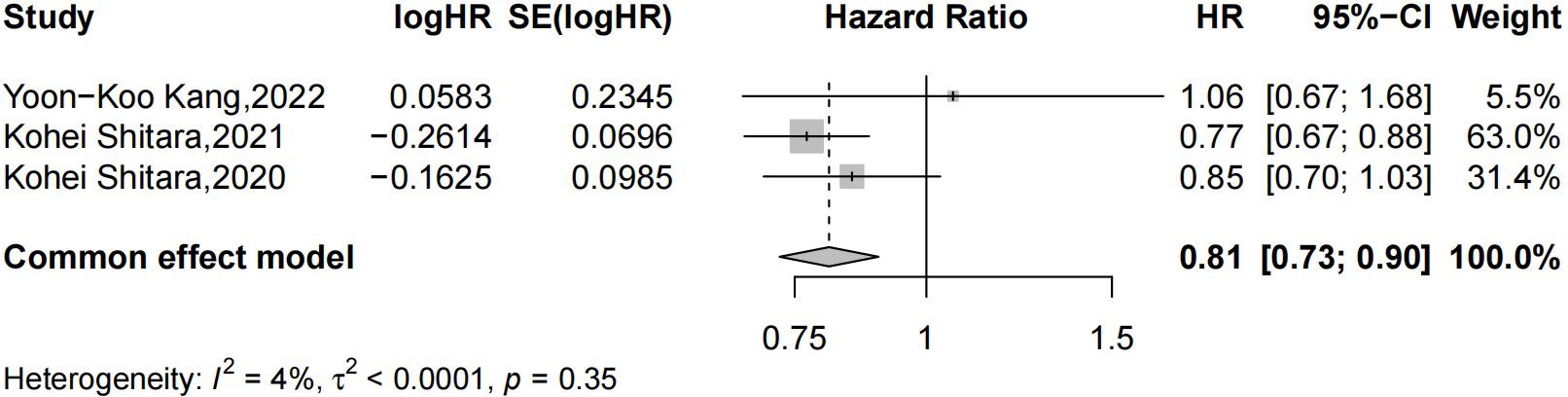 Three studies reported the median OS in CPS ≥ 1 (21, 22, 26). A total of 956 patients received ICIs plus chemotherapy, and 961 received chemotherapy alone. In our present random-effects model, the results from our meta-analysis suggest that for patients with CPS ≥ 1, ICIs + chemotherapy met the criteria for superiority compared with chemotherapy alone for overall survival (HR = 0.81 [95% CI: 0.73–0.90]; p = 0.0001) and without significant heterogeneity between studies (p = 0.35, I2 = 4%) (Figure 6).
