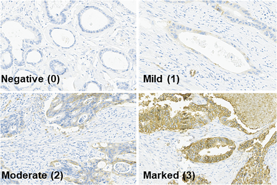 Tissue sampling was performed twice: before neoadjuvant CRT using colonoscopic biopsy (pre-CRT) and during surgery using a surgical specimen (post-CRT). The samples were stained for GLUT-1 using immunohistochemistry with an antibody from Abcam (Cambridge, United Kingdom). The histological score (H-score) for each pre-CRT and post-CRT specimen was calculated by multiplying the percentage of GLUT-1 staining in the specimen by the intensity of GLUT-1 staining in the same specimen. The percentage of GLUT-1 staining was scored from 0 to 100, whereas the intensity of GLUT-1 staining was scored from 0 to 3 (0 denoted negative staining and 3 denoted maximum staining, Figure 1). The immunohistochemical evaluation was performed by one dedicated GI pathologist (Y.K). GLUT-1 expression was considered positive when the H-score was equal to or greater than 1 and was considered negative when the H-score was less than 1.