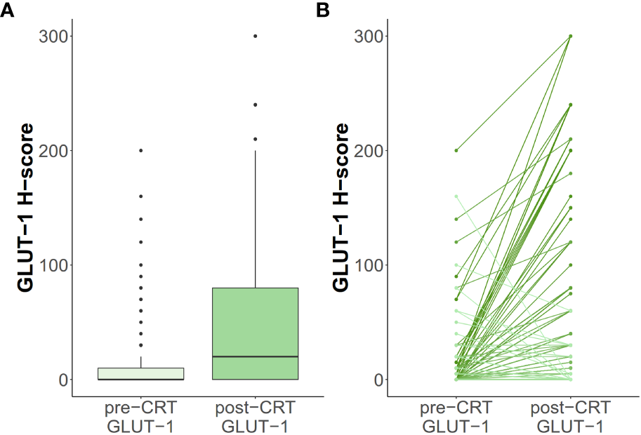 Regarding GLUT-1 status, the median H-scores for pre-CRT and post-CRT specimens were 0 and 12.5, respectively, indicating an increasing tendency after neoadjuvant therapy (Figure 2). The percentages of positive staining were 38% and 61%, in alignment with the increasing tendency of the H-score.