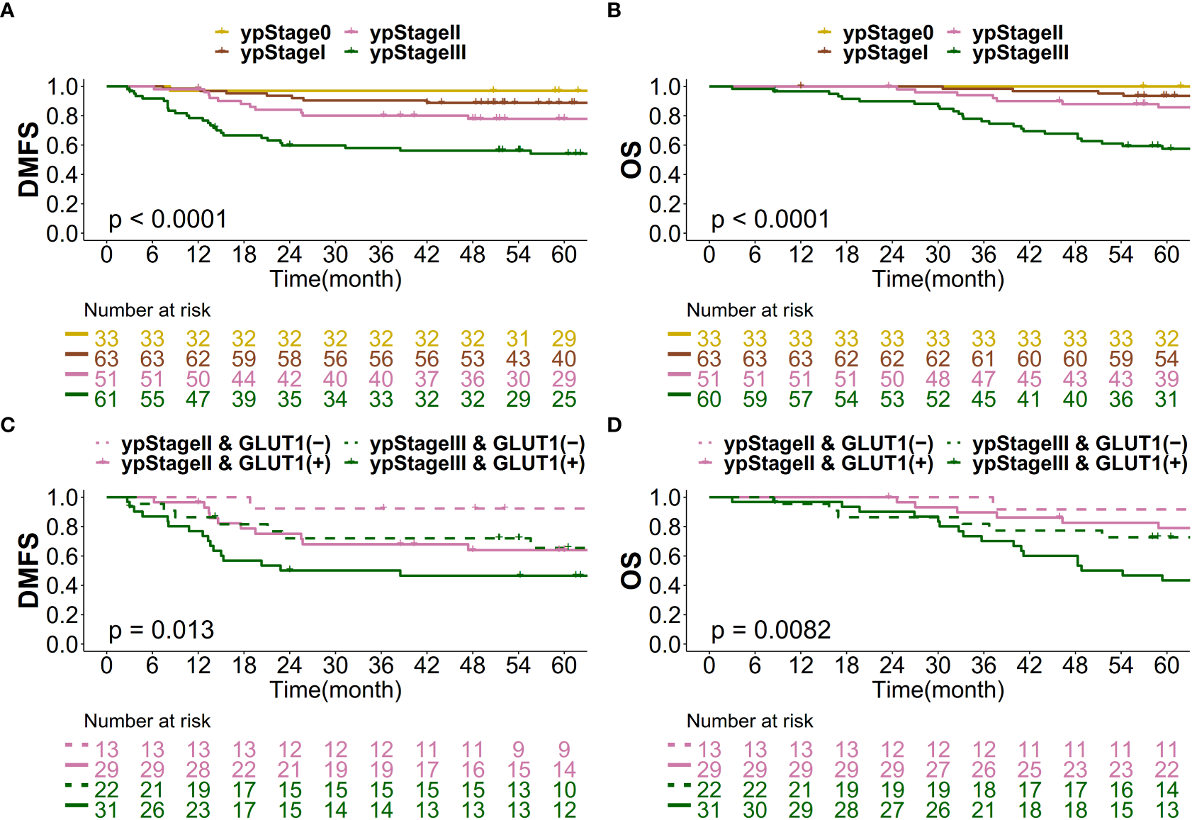 At a median follow-up of 74 months, post-CRT GLUT-1 status showed a significant correlation with worse DMFS (p=0.027, HR 2.26) and OS (p=0.030, HR 2.30). When patients were classified into 4 groups according to yp stage II/III status and post-CRT GLUT-1 positivity [yp stage II & GLUT-1 (-), yp stage II & GLUT-1 (+), yp stage III & GLUT-1 (-), yp stage III & GLUT-1 (+)], the 5-year DMFS rates were 92.3%, 63.9%, 65.4%, and 46.5%, respectively (p=0.013). GLUT-1 (-) groups showed markedly better outcomes for both yp stage II and III patients compared to GLUT-1 (+) groups. A similar tendency was observed for OS.