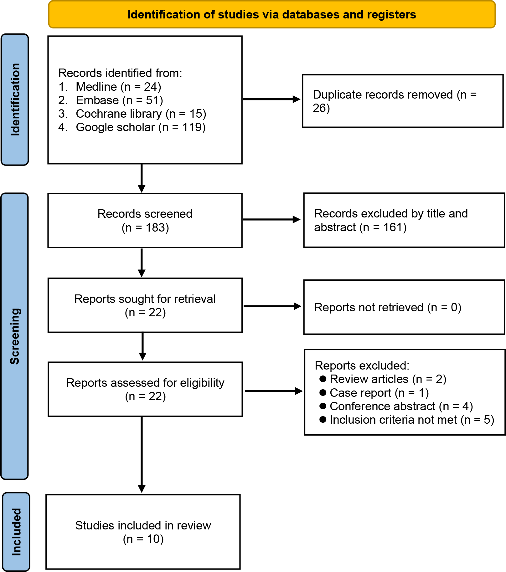Database searching identified 209 potentially eligible records at initial search from Medline, EMBASE, Cochrane library, and Google scholar. Duplicated records (n=26) and those that did not meet the inclusion criteria by title and abstract (n=161) were excluded. Twenty-two studies with full-texts available were assessed for eligibility. After final evaluation, ten trials were included with a total of 13,218 patients (RA ± GA group n=4,884, GA group n=8,334). The included studies were published from 2016 to 2022 (5, 11–16, 24–26) and according to publication dates, six out of ten studies were published in recent five years (5, 11, 12, 14–16). A flow diagram depicting the process of study selection is demonstrated in Figure 1.