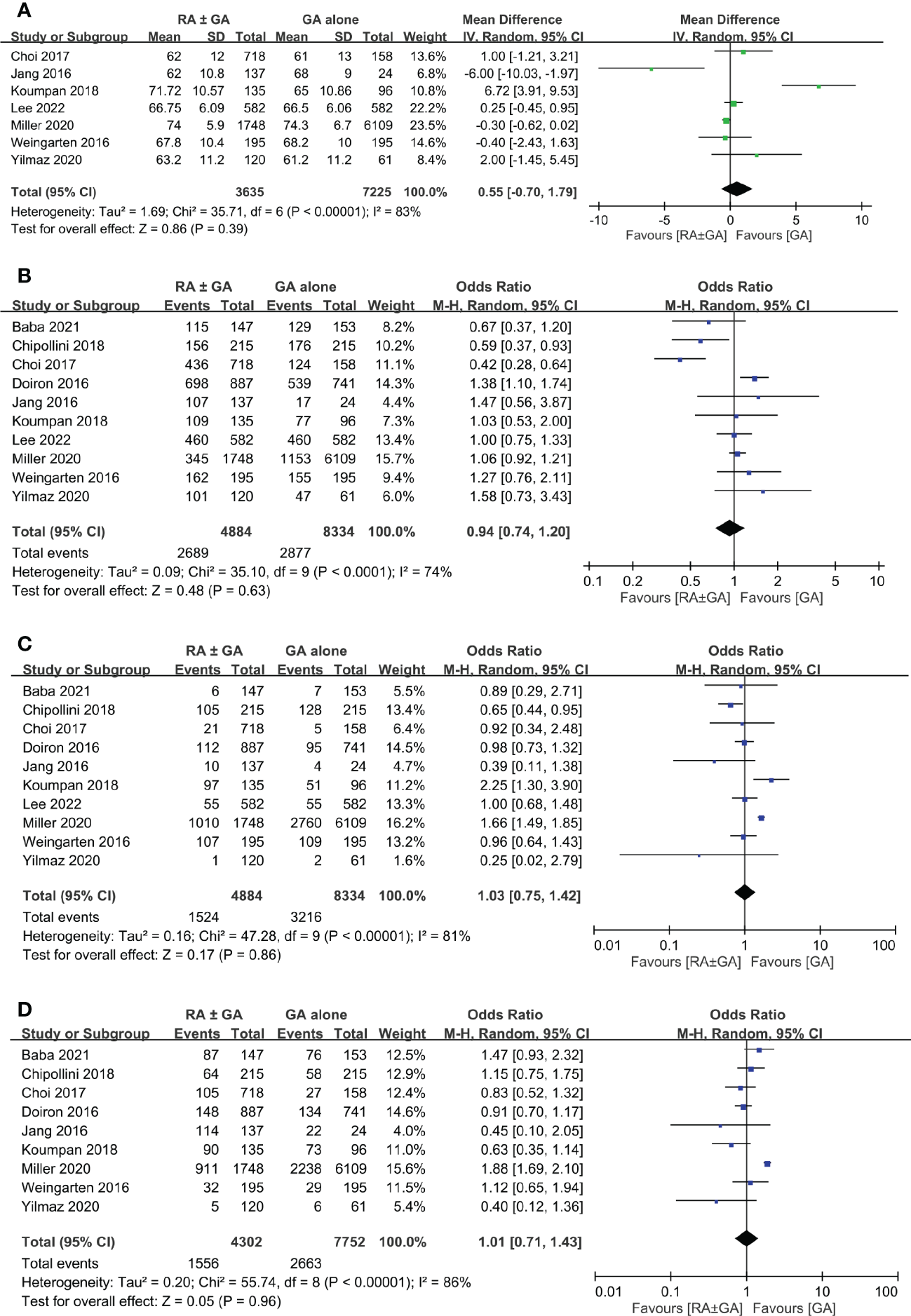 Forest plot showing comparison of (A) age; (B) male gender; (C) severe comorbidities; and (D) chemotherapy treatment between RA ± GA group and GA alone group. RA, regional anesthesia; GA, general anesthesia.