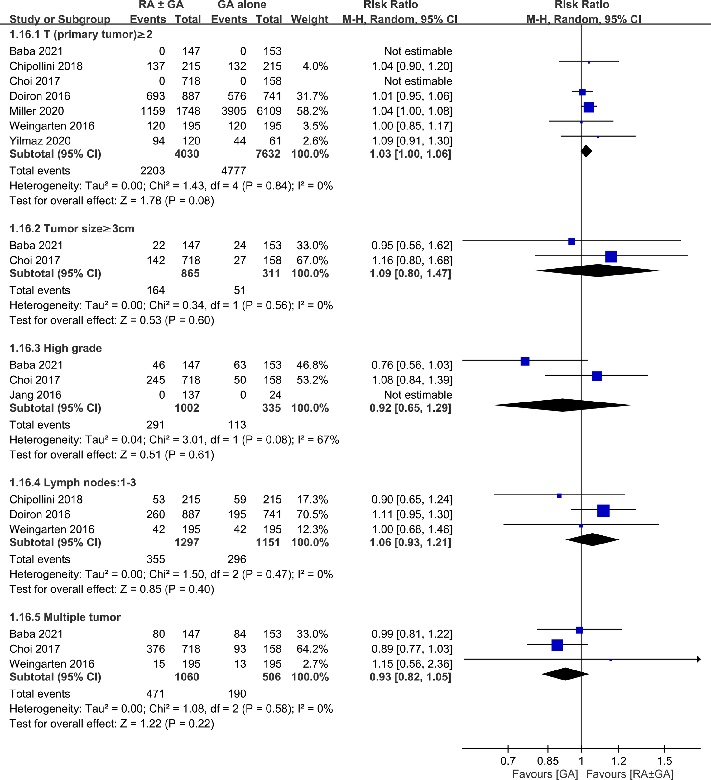There was no difference between RA ± GA group and GA group in age (MD=0.55 years, 95% CI: -0.7 to 1.79, p=0.39) (Figure 3A), the proportion of male gender (OR=0.94, 95% CI: 0.74 to 1.2, p=0.63) (Figure 3B), severe comorbidities (OR=1.03, 95% CI: 0.75 to 1.42, p=0.86) (Figure 3C), and the rate of patients receiving chemotherapy (OR=1.01, 95% CI:0.71 to 1.43, p=0.96) (Figure 3D). The pathological classification between both groups is demonstrated in Figure 4, which showed no difference in tumor-related parameters. Nevertheless, it appeared that the proportion of patients with muscle invasive bladder cancer (i.e., pathological staging T≥2) was higher in the GA group (i.e., 62.6%, 4777/7632) than that in the RA ± GA group (i.e., 54.7%, 2203/4030) without statistical significance.