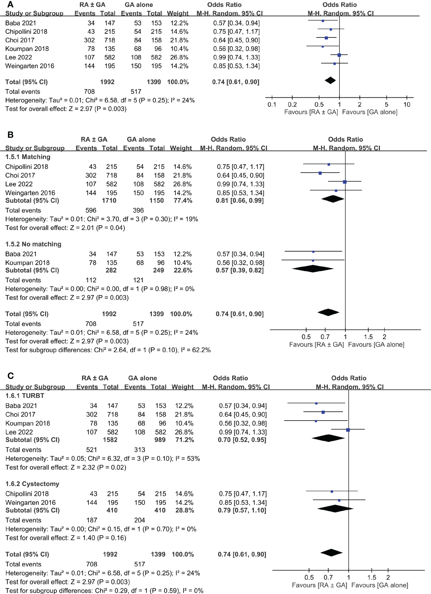 Forest plot showing (A) overall recurrence rate in the RA ± GA group compared to the GA alone group; (B) subgroup analysis of cancer recurrence rate based on study design; and (C) subgroup analysis of cancer recurrence rate based on type of surgery. RA, regional anesthesia; GA, general anesthesia; Matching, used propensity-score matching; No matching, Did not use propensity-score matching; TURBT, transurethral resection of bladder tumor; RC, radical cystectomy.