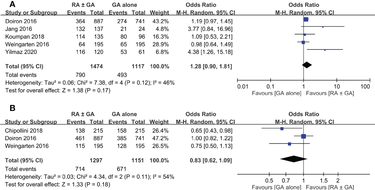 Postoperative overall survival rate was extracted from five studies. There was no significant difference in this outcome between RA ± GA group and GA alone group (OR=1.28, 95% CI: 0.9 to 1.81, p=0.17, I2 = 46%) (Figure 6A). Three studies comprised details on postoperative cancer-specific survival rate, which again was not impacted by the type of anesthetic techniques (OR=0.83 95% CI: 0.62 to 1.09, p=0.18, I2 = 54%) (Figure 6B). In addition, one study investigating the impact of epidural anesthesia use on survival outcomes in 7857 patients undergoing radical cystectomy also reported that the use of RA was not associated with decreased overall survival rate (hazard ratio (HR): 0.99, 0.95-1.04, p=0.73) or cancer-specific survival rate (HR: 0.96, 0.90-1.02, p=0.20) (16).
