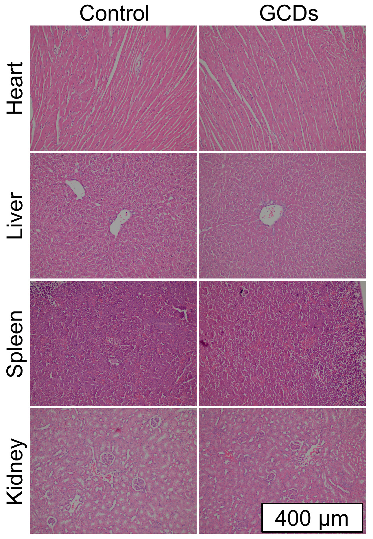 Supplementary Figure 1 | Histological examinations of heart, liver, spleen, and kidney in the control and ginseng-based carbon dots (GCDs)-treated mice.