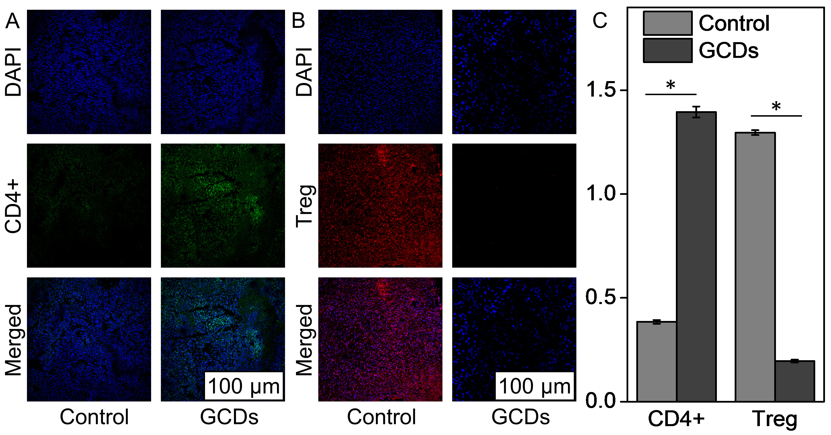 Supplementary Figure 2 | Infiltration of immune cells in the tumors of mice treated or not with ginseng-based carbon dots (GCDs). (A) CD4+ lymphocytes. (B) Regulatory T cells. (C) Quantification of A and B. Data are presented as mean ± SD from three experiments. * P<0.05.