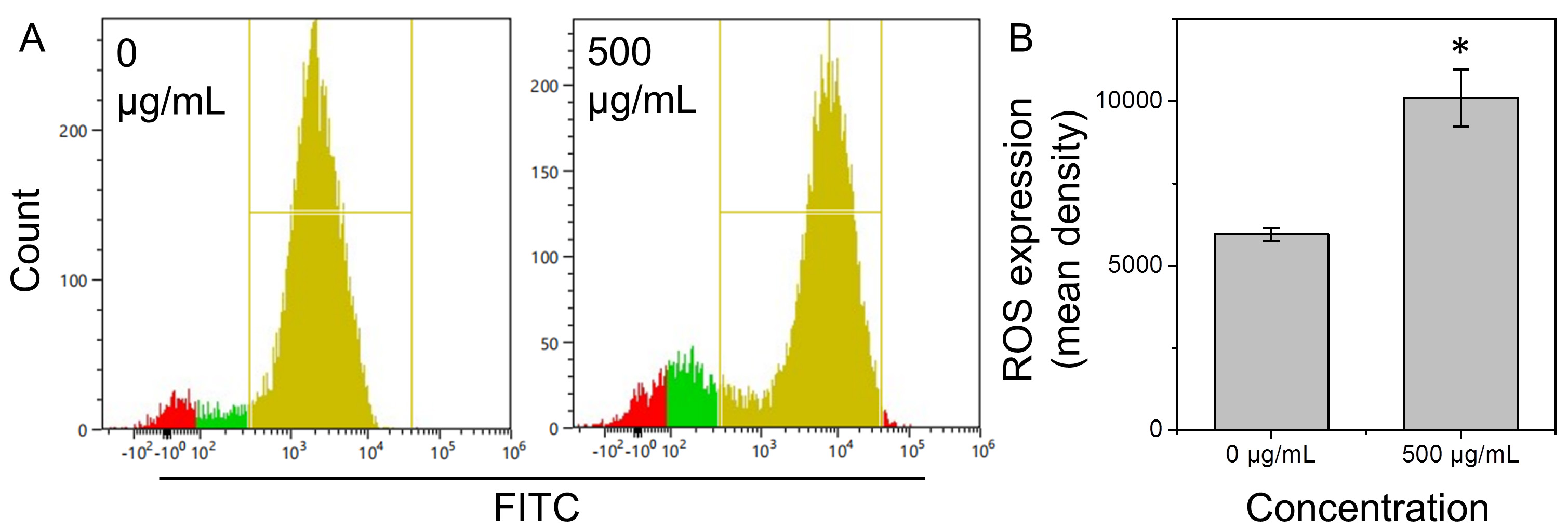 Supplementary Figure 5 | ROS expression by flow cytometry. (A) Images of ROS expression by flow cytometry in Cal-27 cells treated with concentrations of GCDs with 500 μg/mL. (B) Quantification of ROS expression. Data are presented as mean ± SD from three experiments. * P<0.05.