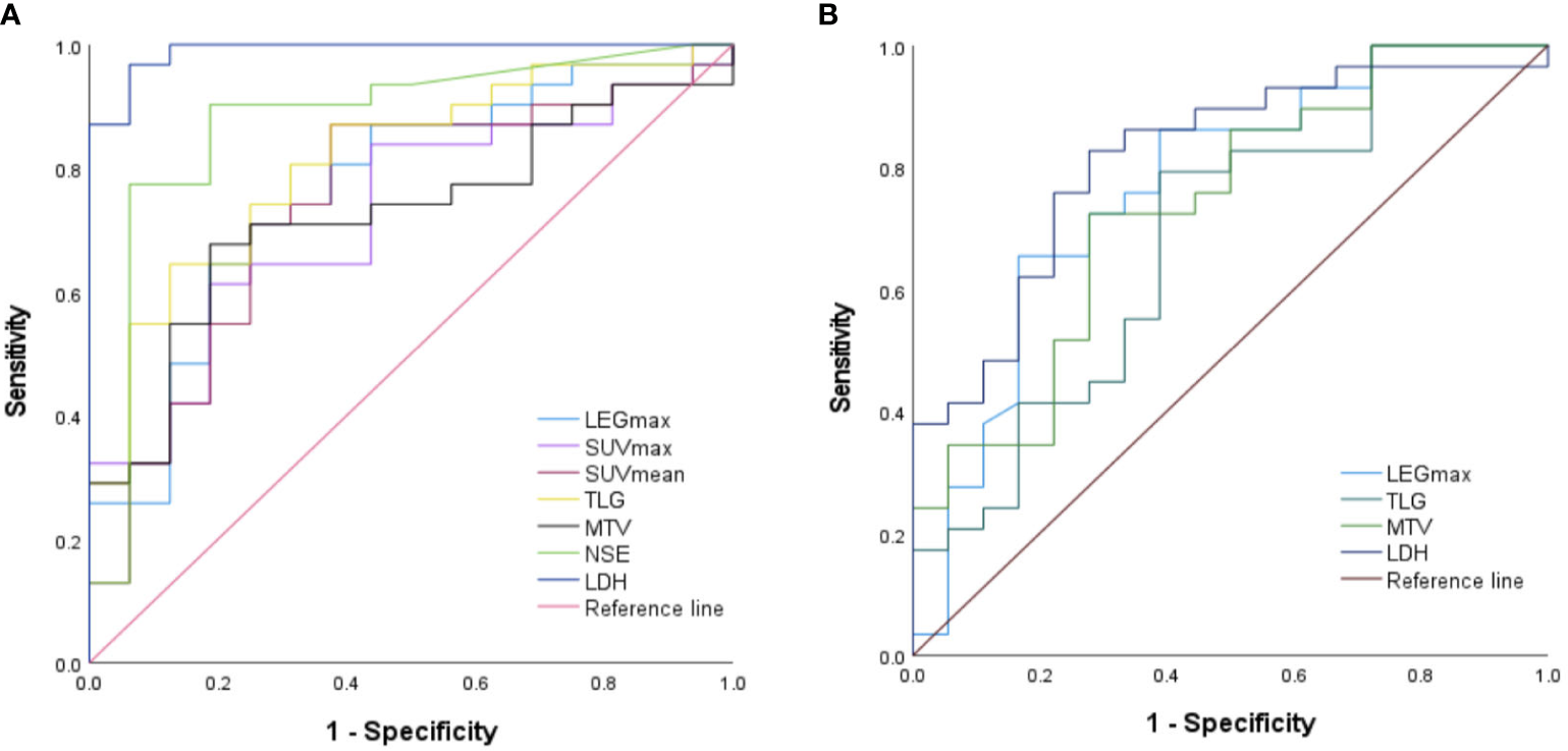 In addition to gender (p=0.543), the age, the levels of LDH and NSE, the LEGmax, 18F-FDG PET/CT metabolic parameters (all p < 0.01), including SUVmax, SUVmean, MTV and TLG are all associated with PFS. In 18F-FDG PET/CT metabolic parameters, higher SUVmax, SUVmean, MTV and TLG were associated with worse PFS.