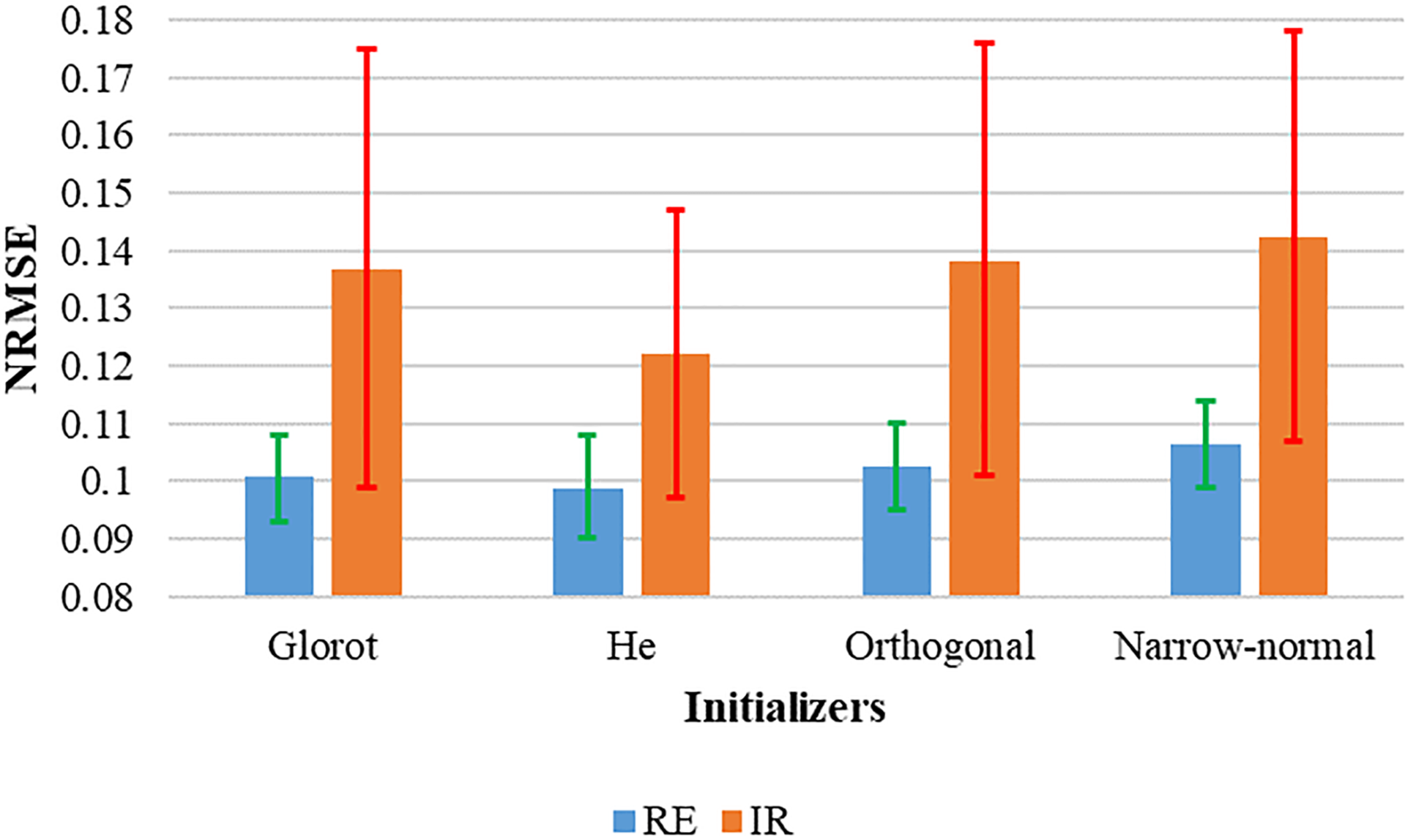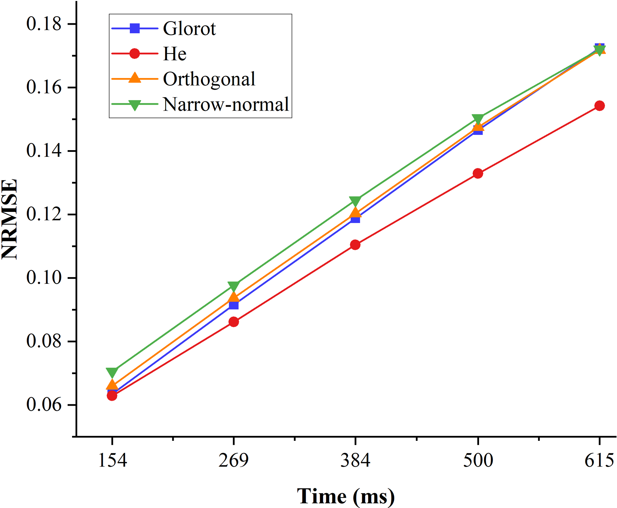 Among the four initializers, the He initializer showed the best performance. The mean NRMSE with 385-ms ahead time using the He initializer was superior by 7.5%, 8.3%, and 11.3% as compared to that using the Glorot, Orthogonal, and Narrow-normal initializer, respectively. The confidence interval of NRMSE using Glorot, He, Orthogonal, and Narrow-normal initializer were [0.099, 0.175], [0.097, 0.147], [0.101, 0.176], and [0.107, 0.178], respectively.