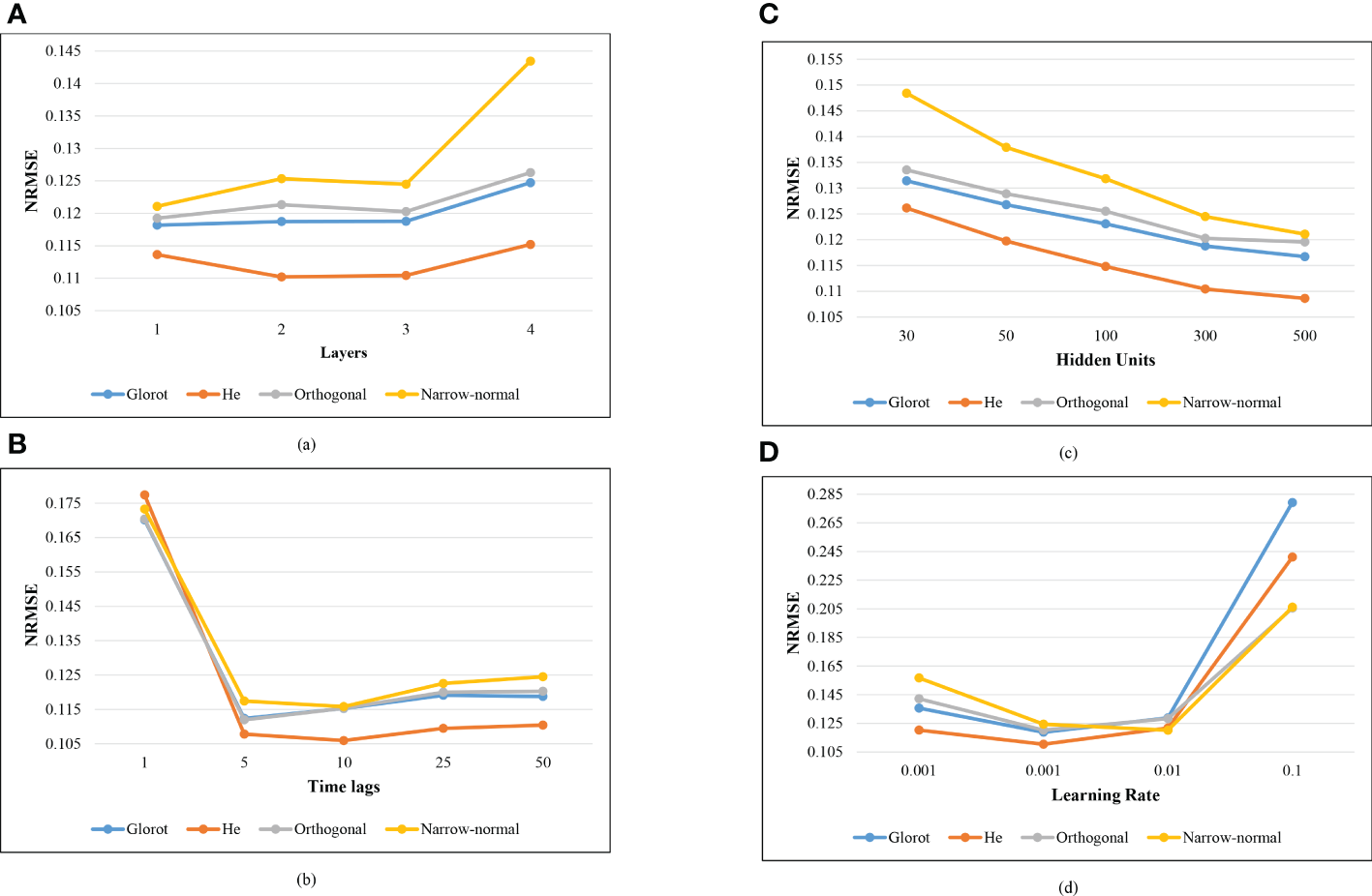 The effect of the four important hyper-parameters on the prediction performance was explored and shown in Figure 5. Four different values (1, 2, 3, and 4) were selected to evaluate the effect of the Nl on the prediction performance (Figure 5A). The LSTM model showed the similar prediction performance with one to three LSTM layers for the Glorot and Orthogonal initializers. For He and Narrow-normal initializers, the LSTM model with two or three LSTM layers showed similar prediction performance. The effect of Tl on the prediction performance was examined by five selected values (1, 5, 10, 25 and 50) (Figure 5B). Time lag of 10 showed the best performance for the He and Narrow-normal initializers, while 5 showed the best performance for the other two initializers. The influence of Hu was explored on five values (30, 50, 100, 300, and 500) (Figure 5C). The prediction performance kept improving as the Hu increased from 30 to 500 for all the four initializers. Four Lr values (0.0001, 0.001, 0.01, and 0.1) were investigated. The NRMSE using the first three initializers (Glorot, He, and Orthogonal) was lowest when Lr was 0.001. Narrow-normal initializer showed the best prediction performance when Lr was 0.01.