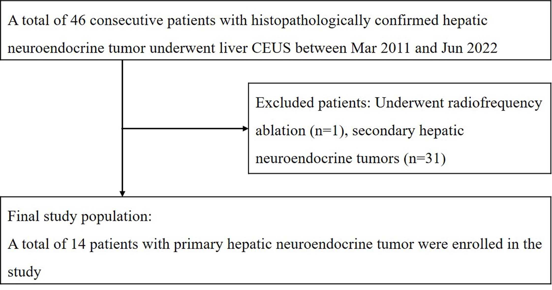 During the time period, a total of 46 patients with hepatic neuroendocrine tumors confirmed by histopathology underwent liver contrast-enhanced ultrasound (CEUS) examinations. One patient underwent radiofrequency ablation before CEUS examinations, and 31 patients with a history of extrahepatic primary neuroendocrine tumors were excluded from the study. Ultimately, 14 patients with pathologically diagnosed primary hepatic neuroendocrine tumors (PHNETs) (6 men and 8 women) with a mean age of 56.9 ± 12.2 (SD) years (ranging from 32-74 years) were included in the study. Figure 1 shows the flowchart for the inclusion of patients with primary hepatic neuroendocrine tumors in the study.