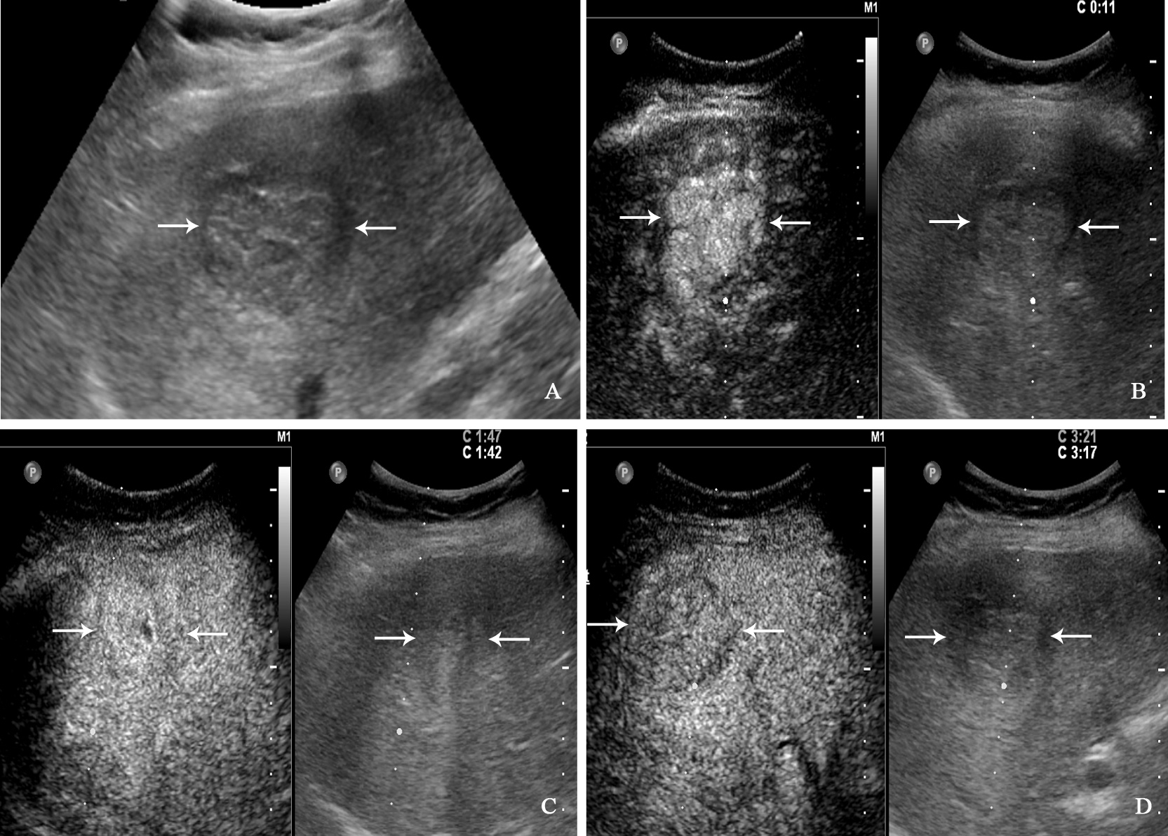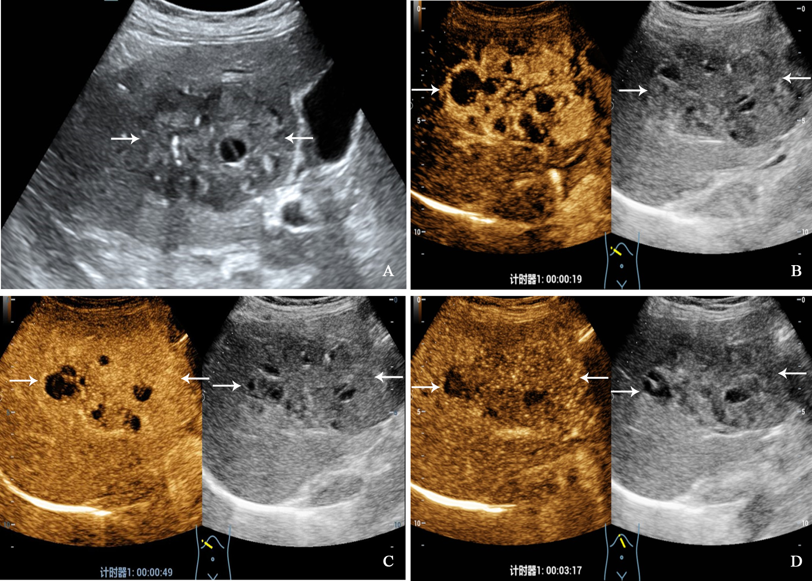 A 71-year-old man with hepatocellular carcinoma. The patient had no chronic hepatitis B and C Conventional ultrasound showed that a hypoechoic tumor with largest diameter of 3.8 centimeters in right liver lobe (A). In the arterial phase of contrast-enhanced ultrasound, the tumor showed homogeneous hyperenhancement (B), and isoenhancement in the portal venous phase (C), finally with slightly washout in the late phase (D).