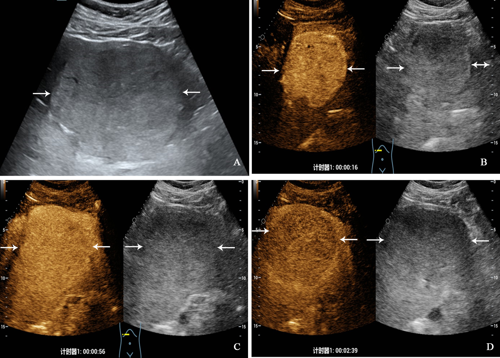 A 32-year-old man with primary neuroendocrine tumor. The patient had no underlying liver disease. Conventional ultrasound showed that a slightly hyperechoic tumor with largest diameter of 10.3 centimeters in left liver lobe (A). In the arterial phase of contrast-enhanced ultrasound, the tumor showed homogeneous hyperenhancement (B), and began washout at 56 seconds (C), hypoenhancement in the late phase (D).