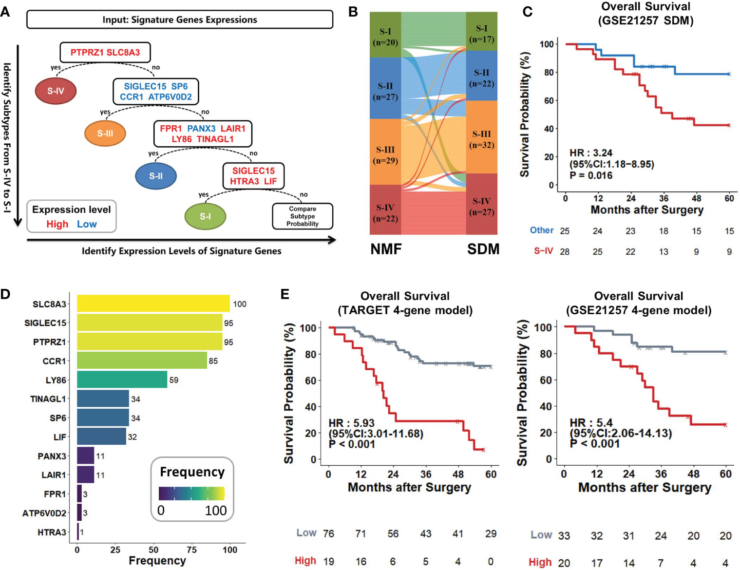 Figure 7 Establishment and evaluation of two predictive models. (A) Schematic workflow of the subtype diagnostic model. Osteosarcoma patients were sequentially stratified according to 13 marker genes with high (red) or low (blue) expressions. (B) Sankey diagram showed that subtypes identified by SDM matched very closely with those by the NMF method. Each rectangle represented a subtype, and each row represented a patient sample. The connection degree was visualized based on the size of rectangles. (C) Kaplan–Meier curves of S-IV and other patients predicted by SDM in the GSE21257 dataset (S-IV, n = 28; others, n = 25). (D) PTPRZ1, SLC8A3, SIGLEC15, and CCR1 were the top four genes that were selected most frequently within the 100 iterations. They were retained to develop the LASSO model. (E) Kaplan-Meier curves. The 4-gene model with high scores led to poorer outcomes compared to the low in the TARGET cohort and GSE21257 dataset. P values were calculated by log-rank test.