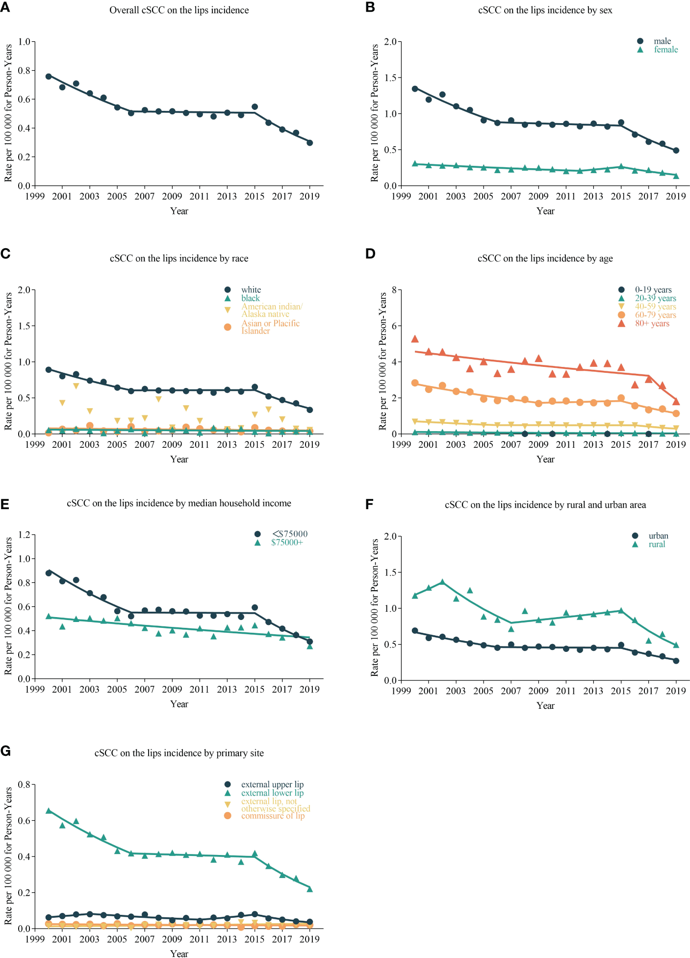 Among 8,625 patients diagnosed with cSCC on the lips from 2000 to 2019, men (74.67%), white (95.21%), and 60–79 years old were the most common population, and 3,869 deaths from cSCC on the lips occurred. The overall incidence of cSCC on the lips was 0.516 per 100,000 person-years. cSCC on the lip incidence rates were highest among men, white, and patients aged 60–79 years old. cSCC on the lip incidence rates decreased by 3.210%/year over the study period. The incidence of cSCC on the lips has been decreasing in all sexes, ages, high- or low-income households, and urban or rural patients. The overall incidence-based mortality rate of cSCC on the lips during 2000–2019 was 0.235 per 100,000 person-years. cSCC on the lip incidence-based mortality rates were highest among men, whites, and people older than 80 years old. cSCC on the lip incidence-based mortality increased by 4.975%/year over the study period. cSCC on the lip incidence-based mortality rates increased for all sexes, races, ages, primary sites, high- or low-income households, and urban or rural patients during the study period.