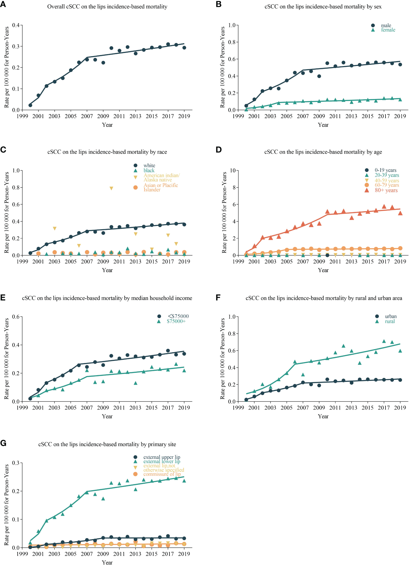 Patients diagnosed with cSCC on the lips between 2000 and 2019 from the 17 registries of the USA were identified. Incidence and incidence-based mortality rates were analyzed using SEER*Stat 8.4.0.1 software. This paper calculated incidence rates and incidence-based mortality rates by 100,000 person-years for sex, age, race, SEER registries, median household income ($/year), rural-urban distribution, and primary site. The annual percent changes (APC) in incidence and incidence-based mortality rates were then calculated using joinpoint regression software.