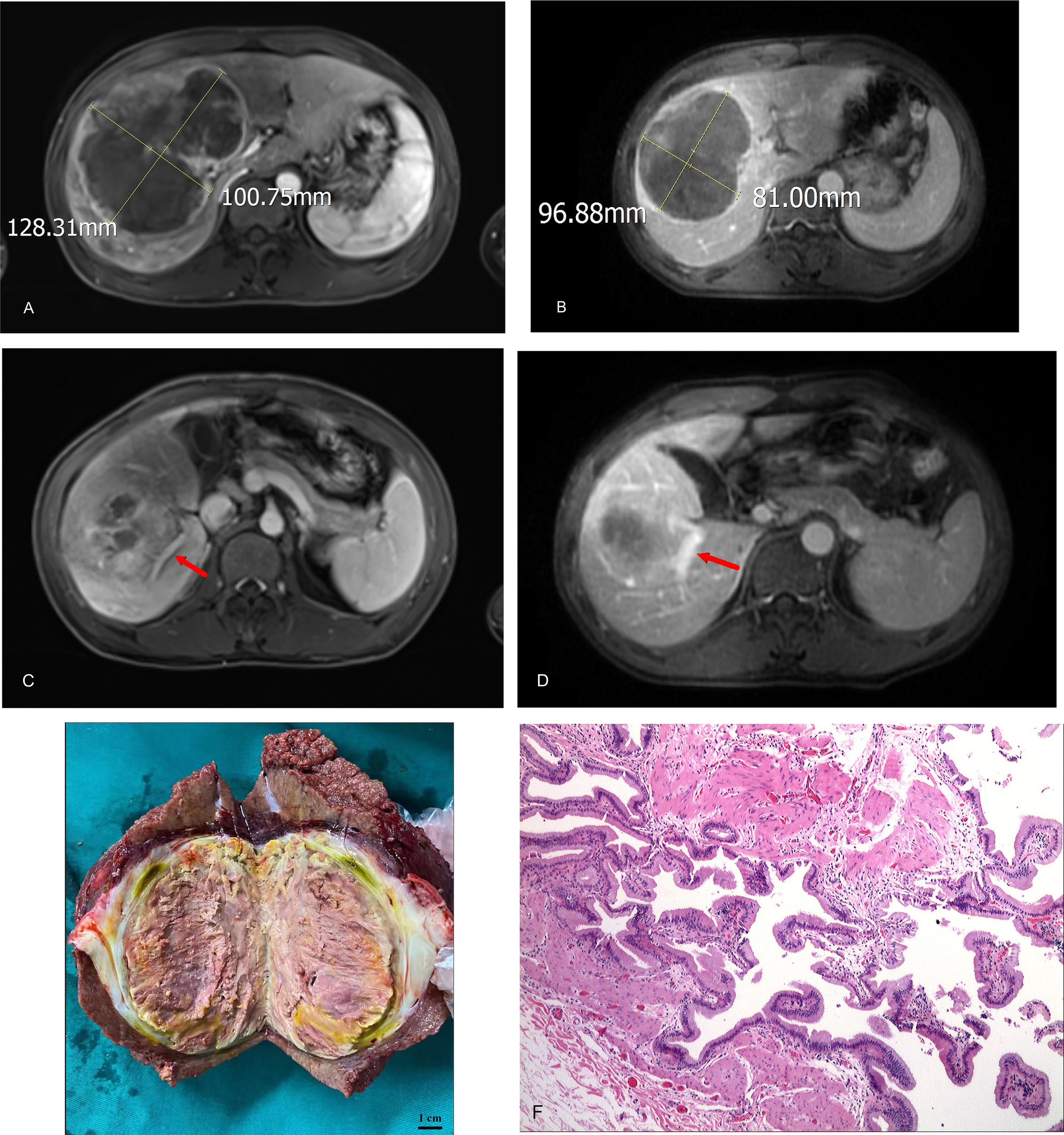 (A) initial tumor size (portal vein phase); (B) post-treatment/pre-operative tumor size (portal vein phase); (C) portal vein involvement(pre-treatment); (D) portal vein involvement (post-treatment/pre-operative); (E) Tumor specimens; (F) Pathological images (200X).