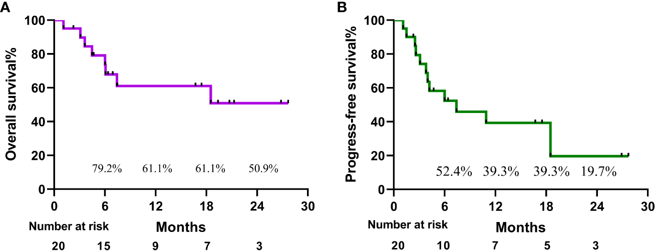 Between June 2020 and October 2022, a total of 20 patients with intermediate-advanced uHCC were enrolled. All cases had multiple intrahepatic metastases, or macrovascular invasion, or both, among whom 5 cases with lymph node or distant metastases. Until September 2022, the median follow-up time was 7.2 months (range, 1.1-27.7 months). Median survival time could not be assessed at the moment, based on iRecist, median PFS was 7.4 months (range, 1.1-27.7 months), ORR 15.0%, and DCR 50.0%. 14 patients experienced treatment-related adverse events with an incidence of 70%. The overall survival rates at 18 months and 24 months were 61.1% and 50.9%, respectively. And the progression-free survival rates were 39.3% and 19.7%.