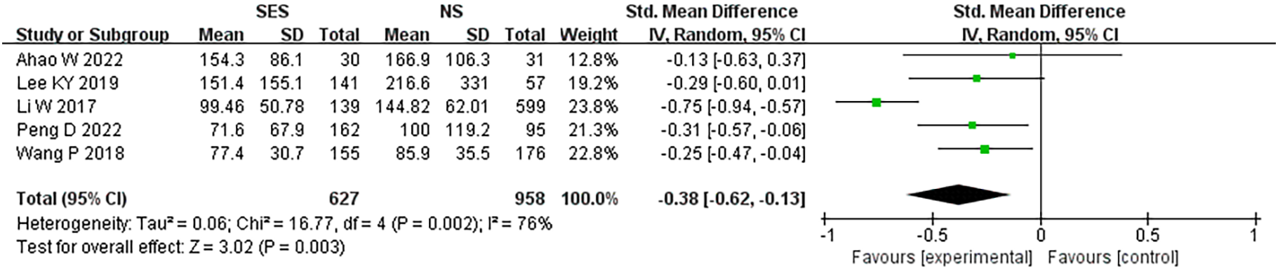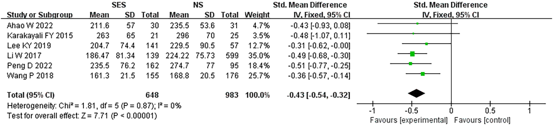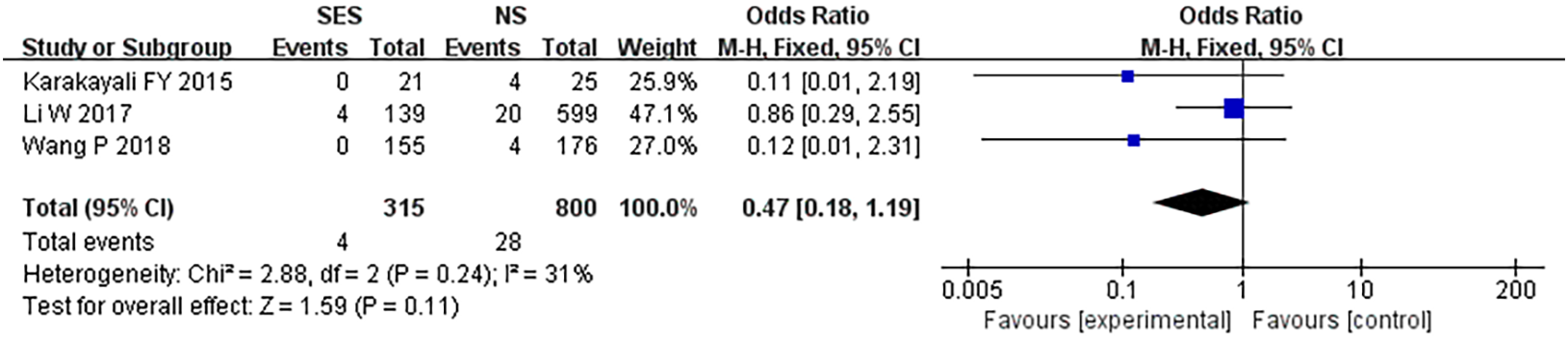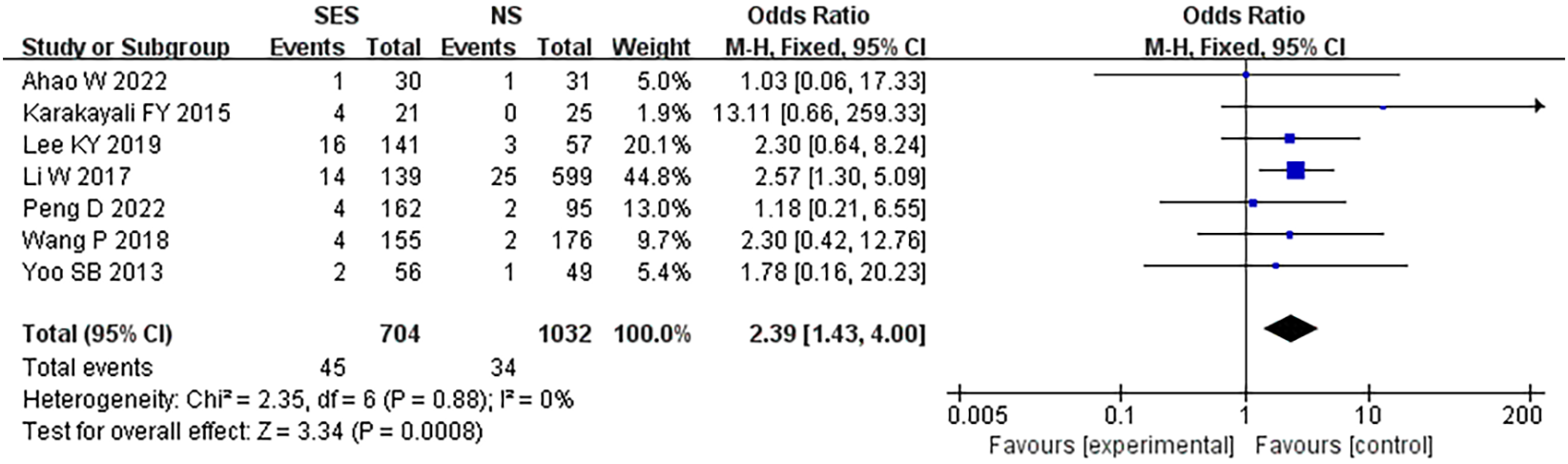 Table 3 presents the results of the pooled analysis of overall stoma-related complications. The SES group was significantly higher than the NS group in terms of total stoma-related complications (OR, 2.11, 95% CI 1.37-3.26; p=0.0007; I2 = 18%). There was no statistical difference between the SES and NS groups in terms of stoma edema (OR, 0.8, 95% CI 0.4-1.59; p=0.52; I2 = 43%), stoma prolapse(OR, 1.93, 95% CI 0.71-5.23; p=0.20; I2 = 0%), stoma necrosis(OR, 0.17, 95% CI 0.02-1.54; p=0.12; I2 = 0%), stoma infection(OR, 3.39, 95% CI 0.83-13.78; p=0.09; I2 = 0%), stoma bleeding(OR, 1.16, 95% CI 0.26-5.23; p=0.85; I2 = 21%), stoma stenosis(OR, 1.69, 95% CI 0.45-6.35; p=0.44; I2 = 45%), skin inflammation around the stoma(OR, 1.28, 95% CI 0.76-2.15; p=0.35; I2 = 0%) and stoma retraction(OR, 4.09, 95% CI 0.83-20.08; p=0.08; I2 = 0%).