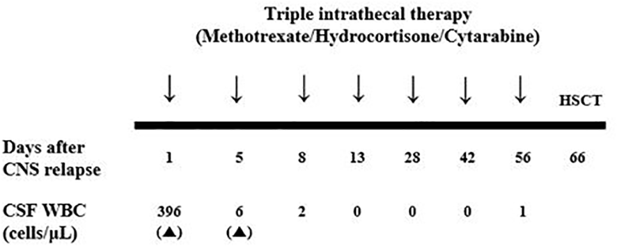 Schedule of triple intrathecal chemotherapy after CNS blast crisis and serial results of CSF WBC count. CNS, central nerve system; CSF, cerebrospinal fluid; WBC, white blood cell.